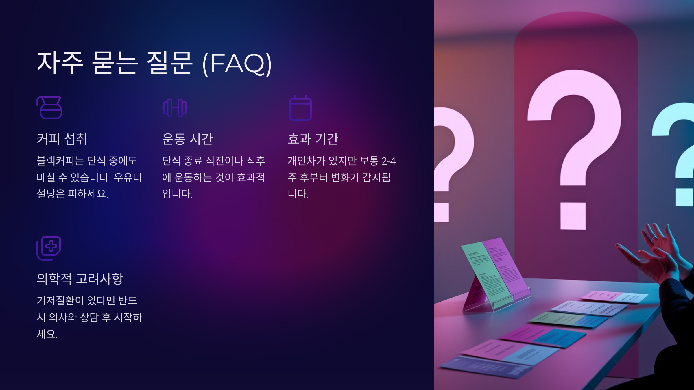 A2. 가능해요! 다만, 단식 상태에서 고강도 운동은 무리가 갈 수 있으니 가벼운 유산소 운동이나 요가부터 시작하는 것이 좋아요. 🏃♂️