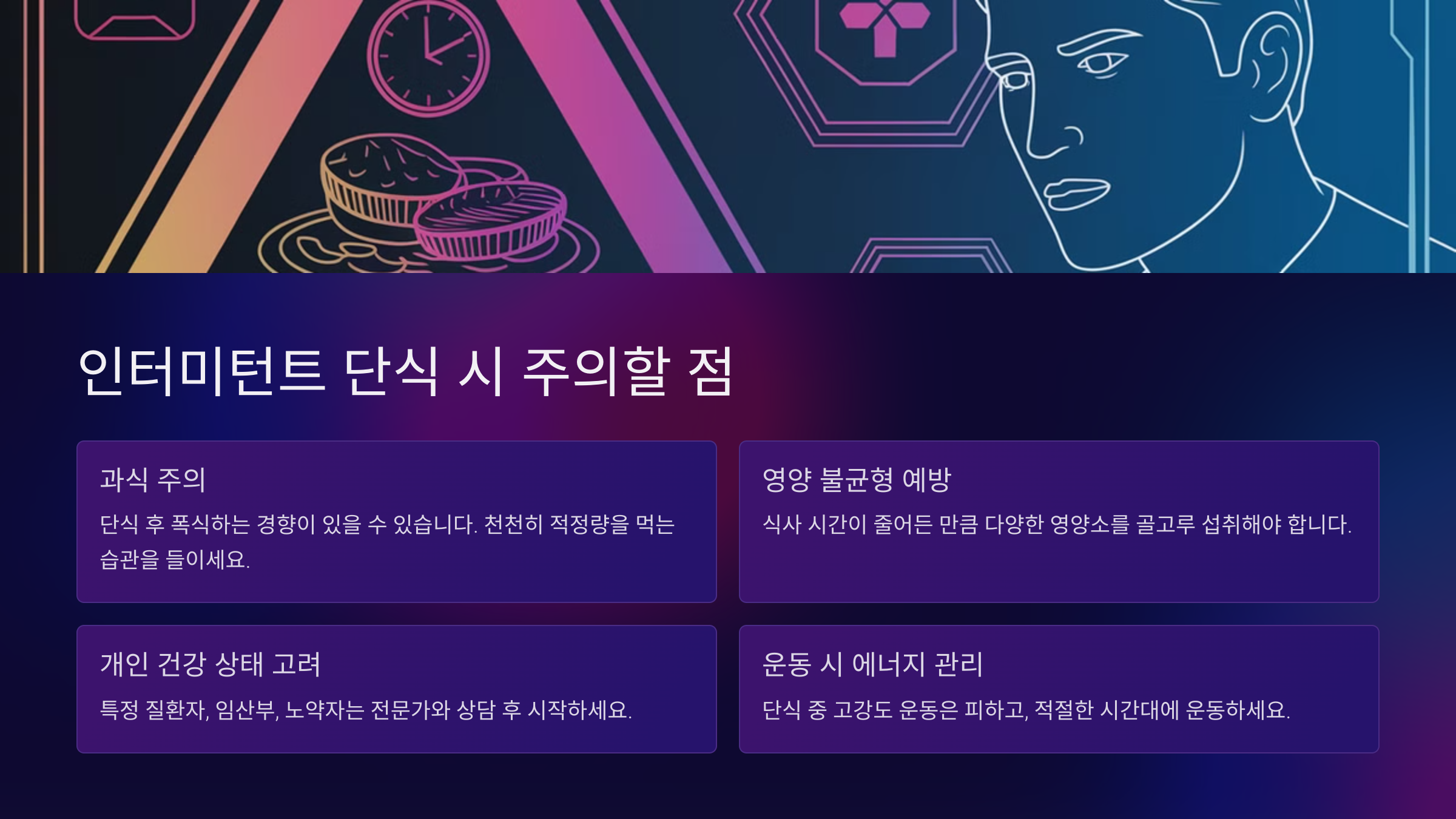 인터미턴트 단식은 올바르게 실천하면 건강에 많은 도움이 되지만, 무리하면 오히려 몸에 해로울 수 있어요. 몇 가지 중요한 주의사항을 살펴볼까요? 🧐