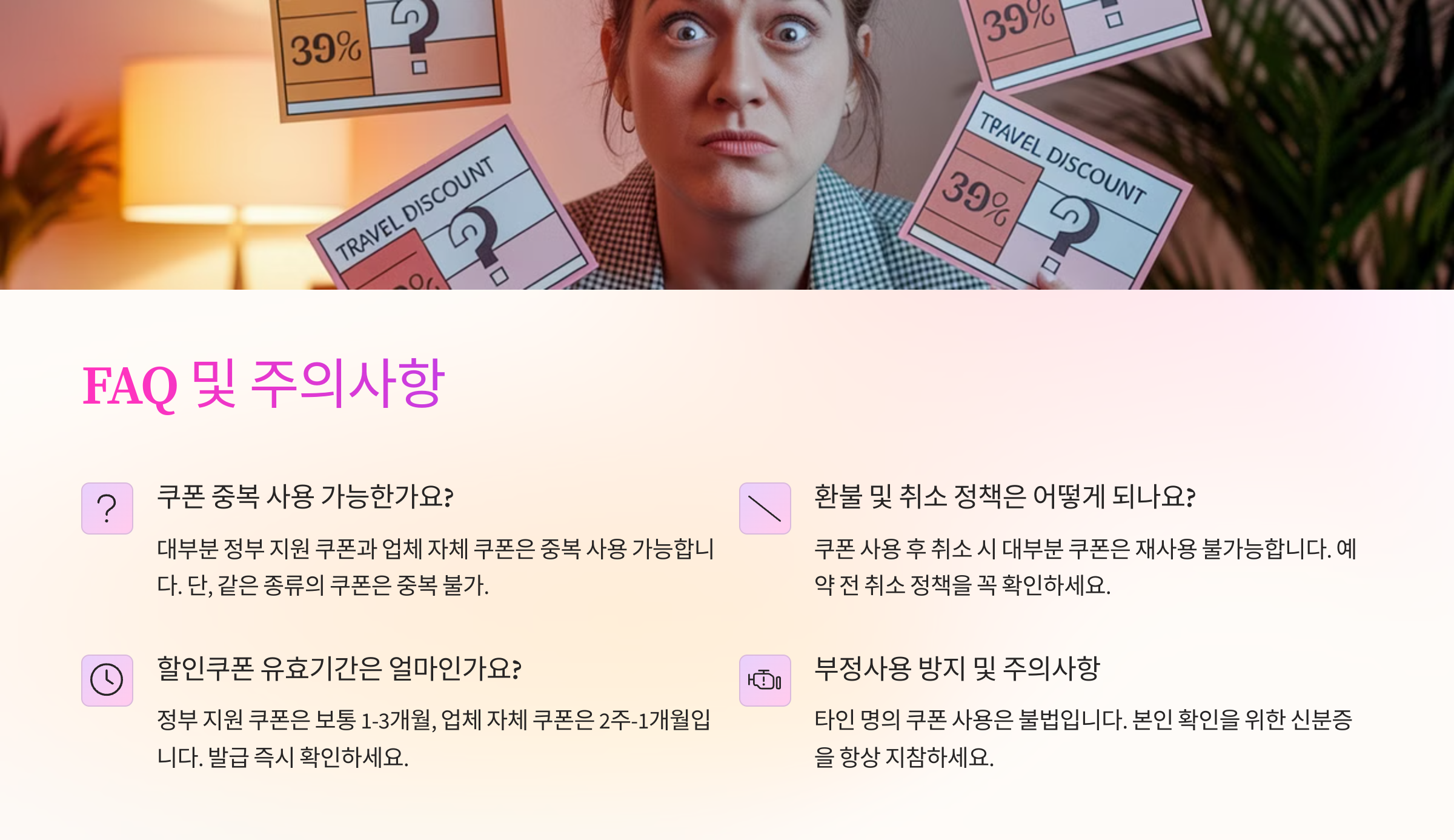 국내 여행을 저렴하게 즐길 수 있는 할인쿠폰은 생각보다 다양해요! 숙박, 관광지, 교통, 식사 할인 등 여러 가지 유형이 있는데요. 어떤 종류가 있는지 한눈에 알아볼까요? 👀