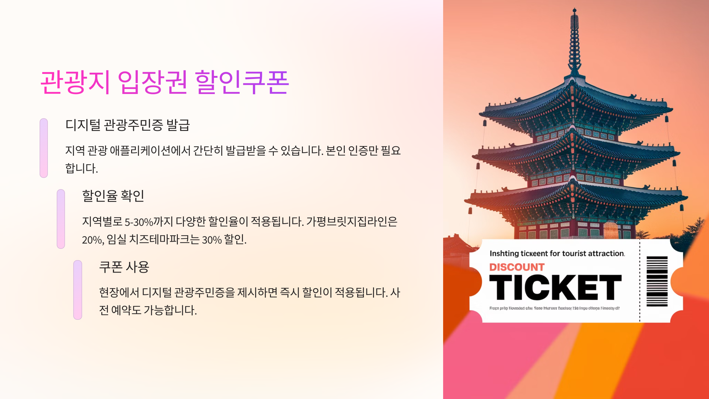 | 지역 관광 패스 | 최대 40% | 서울패스, 부산패스 | 여러 관광지 이용 가능 |