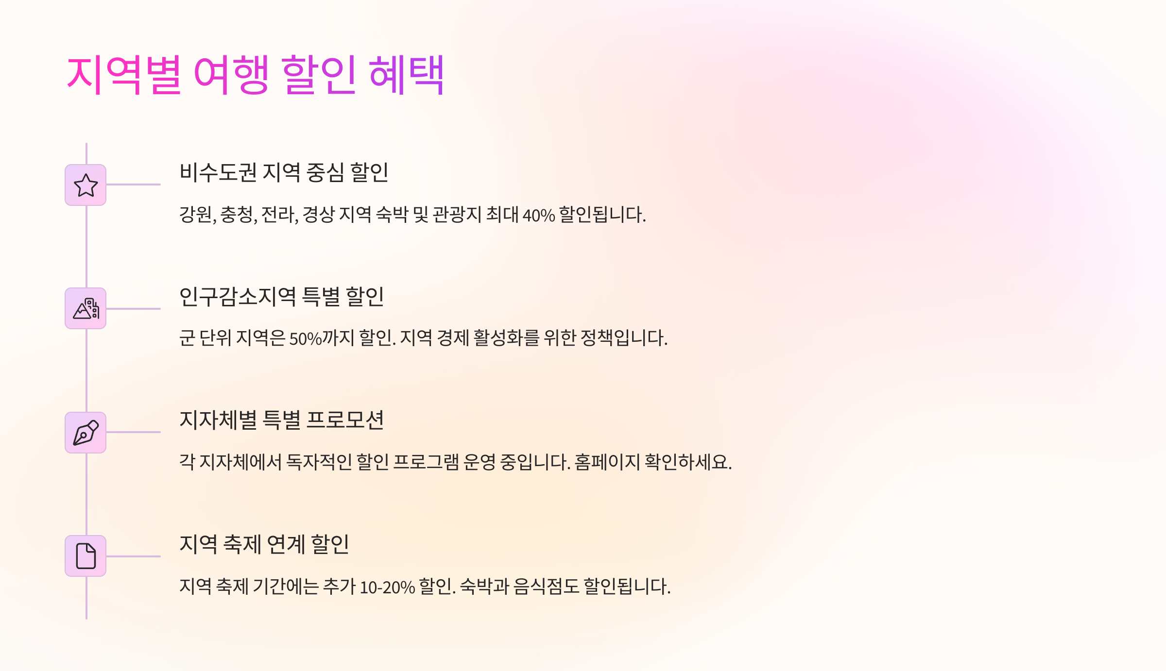 한국의 다양한 지역에서는 여행객을 위한 특별 할인 혜택을 제공하고 있어요! 서울, 부산, 제주 등 각 지역에서 받을 수 있는 할인 정보를 확인해 볼까요? ✈️