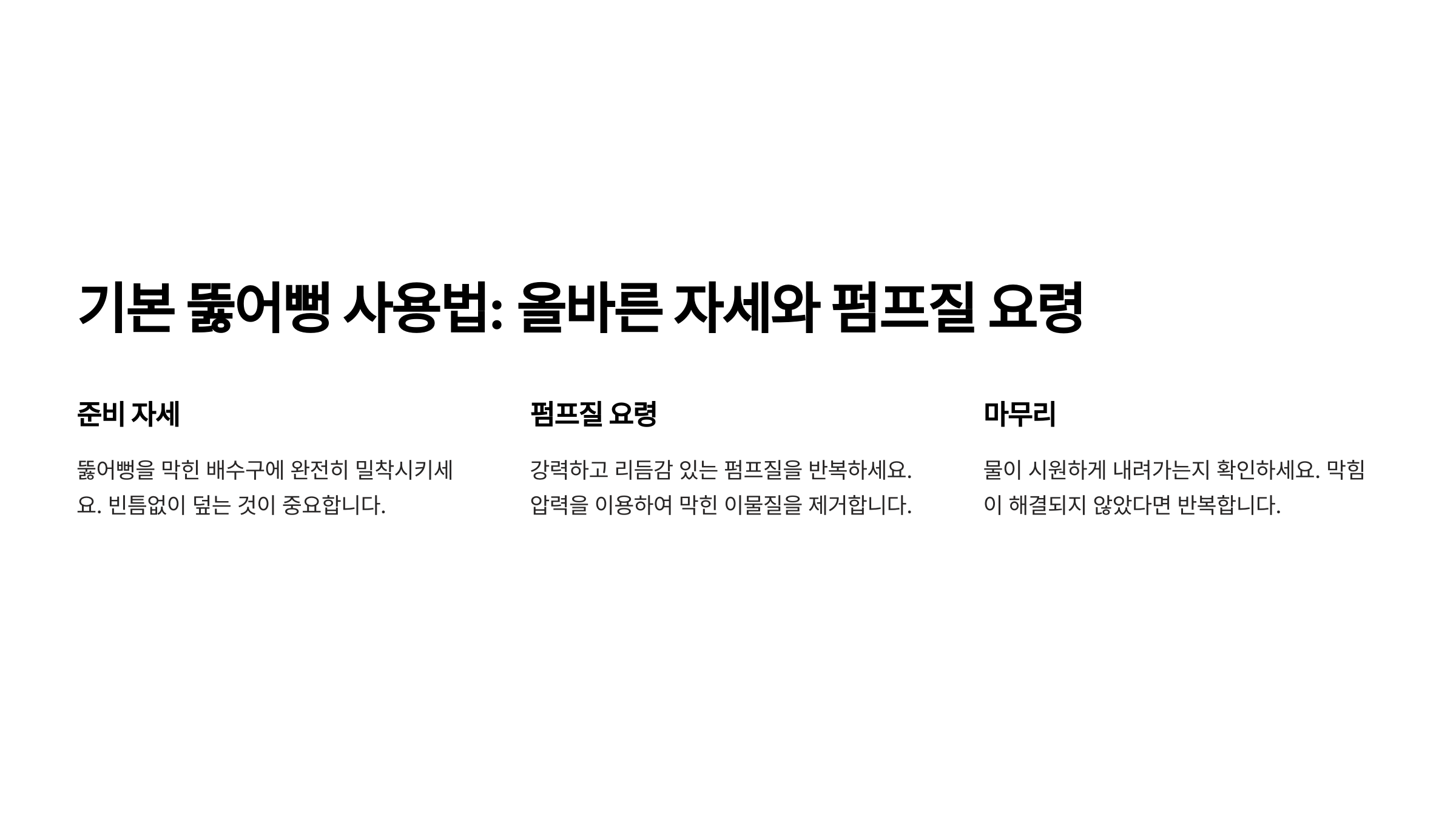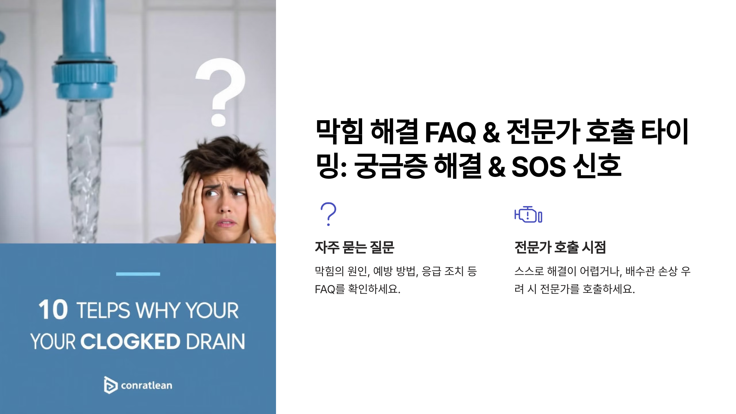 ✅ 전문가를 불러야 하는 상황 - 변기에서 물이 역류하여 넘치는 경우 - 악취가 지속되거나 배수구에서 이상한 소리가 나는 경우 - 배관이 손상되어 물이 새거나 물이 아예 내려가지 않는 경우 - 가정용 도구(뚫어뻥, 세정제 등)로 해결이 안 되는 경우