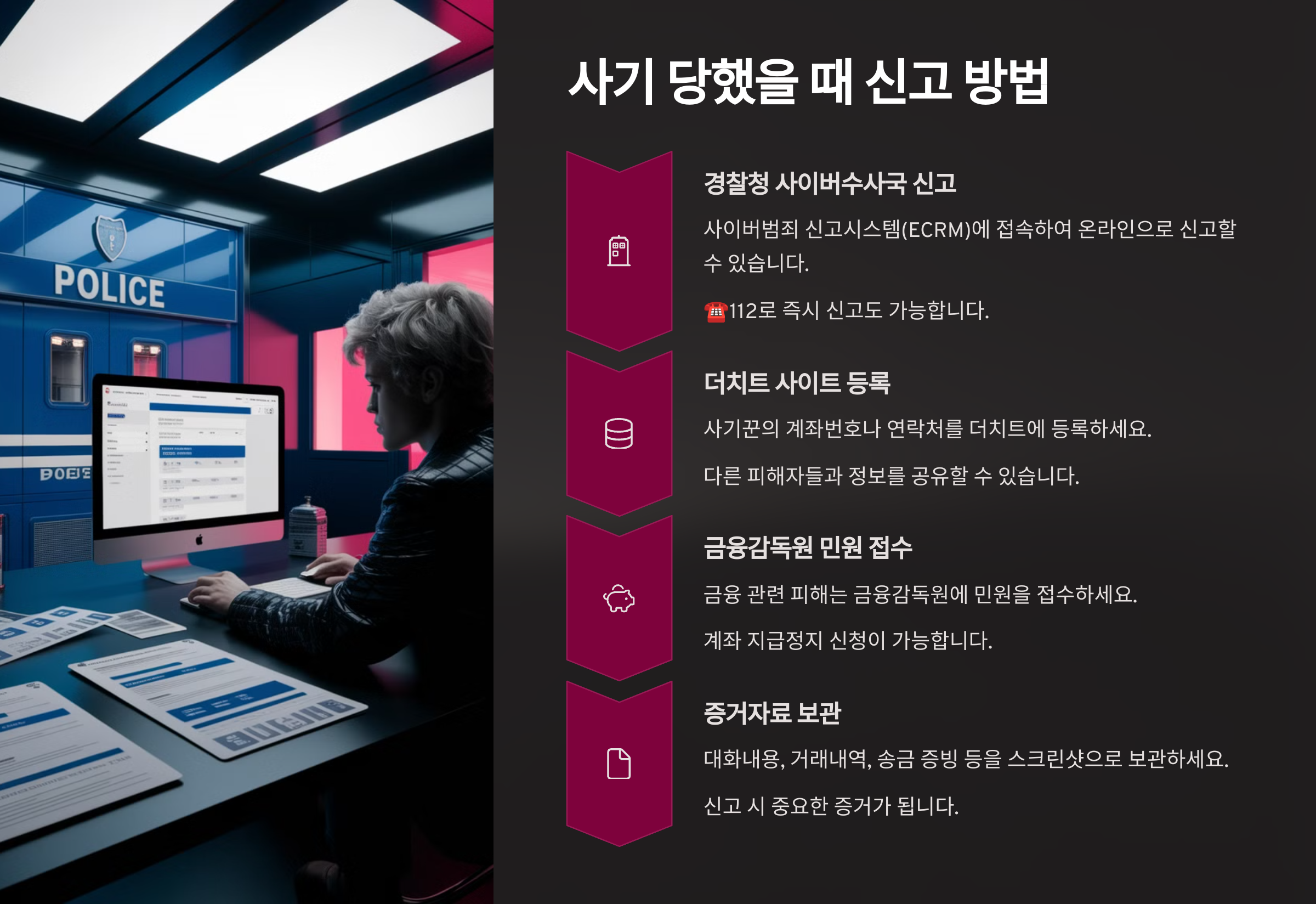 사기를 당했다고 포기하지 말고, 신속하게 신고하면 범인을 잡고 피해 금액을 되찾을 가능성이 높아져요! 🚔