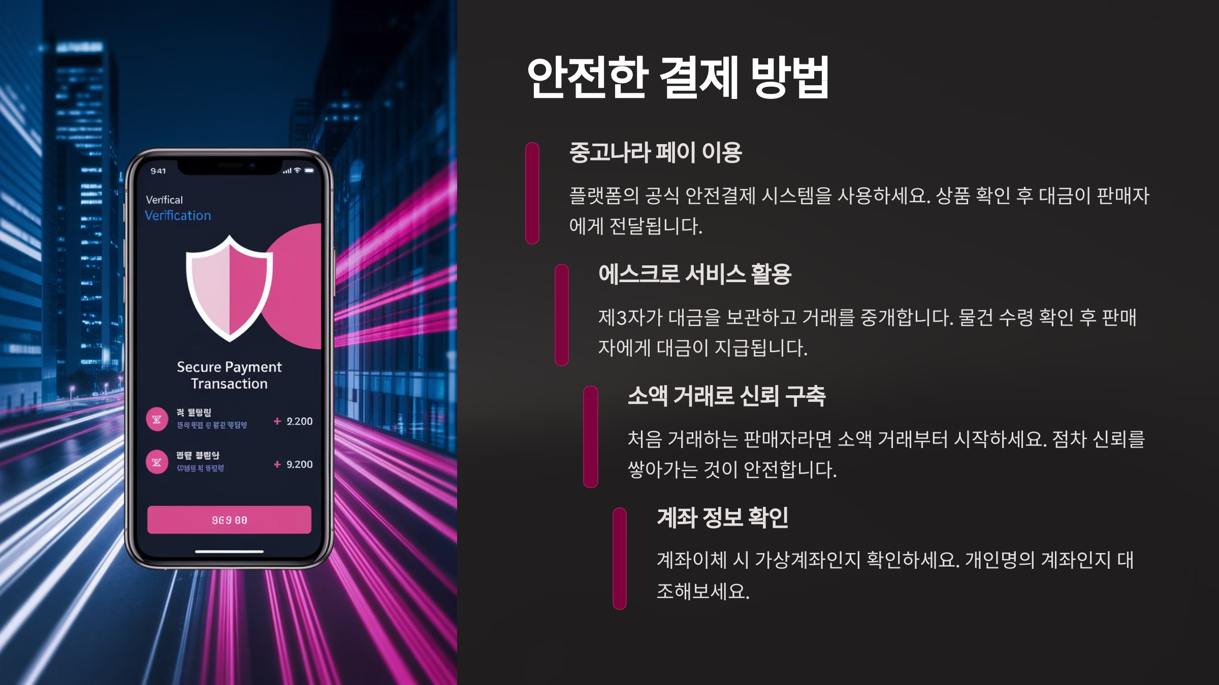 중고거래에서 가장 중요한 것은 안전한 결제 방식이에요. 사기꾼들은 직거래를 피하고 송금만 유도하는 경우가 많기 때문에, 믿을 수 있는 결제 방식을 선택해야 해요.