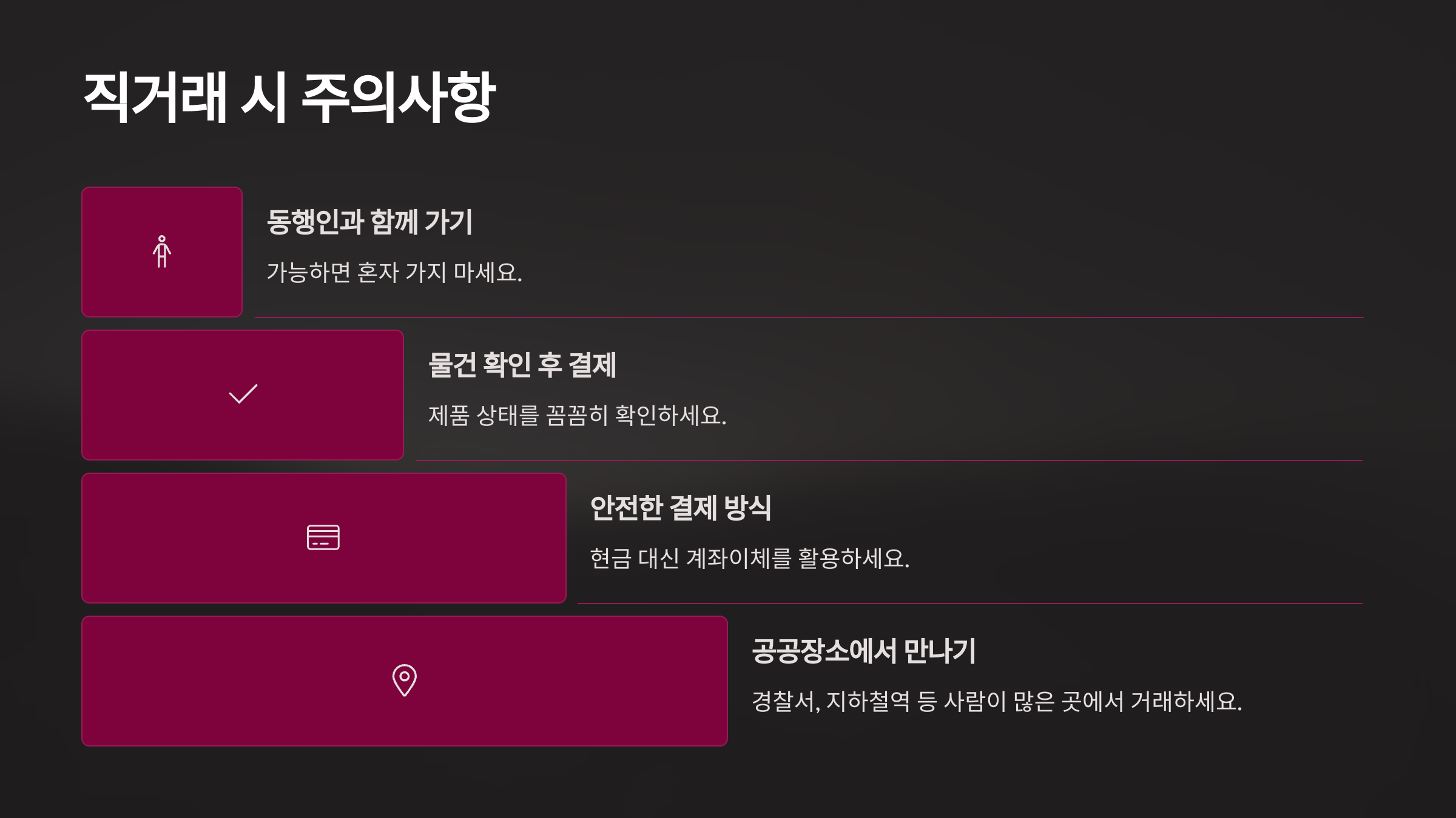 | 사람이 많은 곳에서 거래 | 공공장소에서 만나야 안전 | 지하철역, 카페, 경찰서 앞 추천 |