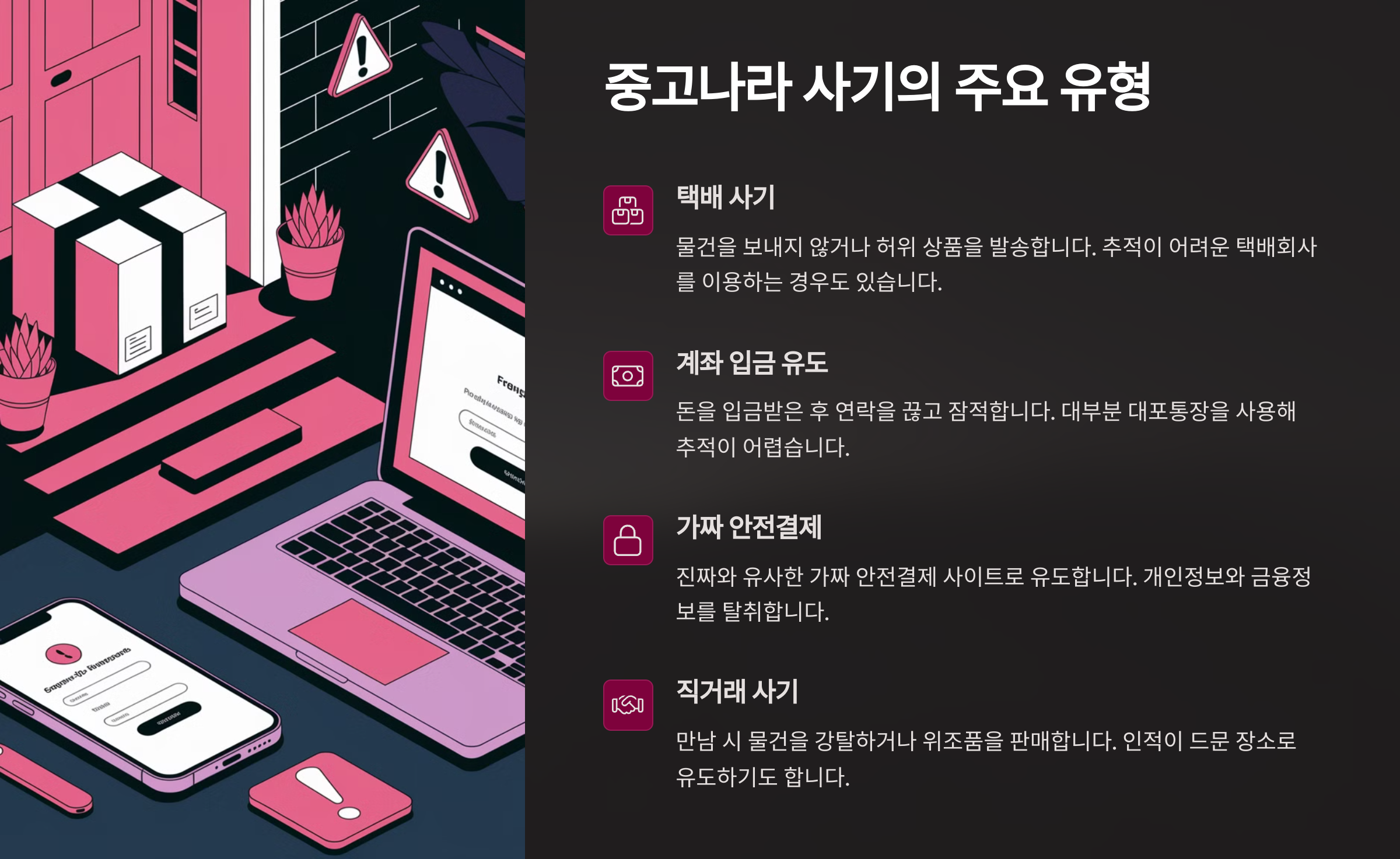 | 택배 사기 | 상품 대신 쓰레기나 벽돌 배송 | 직거래 또는 안전결제 선택 |