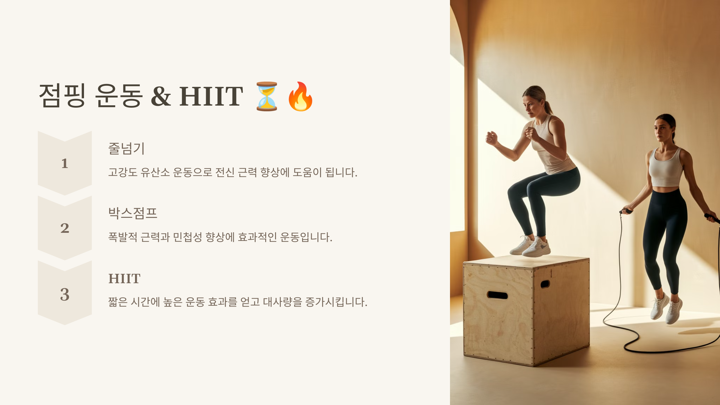 줄넘기는 1~2분씩 인터벌로 진행하면 심폐 지구력을 기르는 데 좋고, 박스 점프는 하체 근력을 키우면서도 칼로리 소모가 높은 운동이에요.