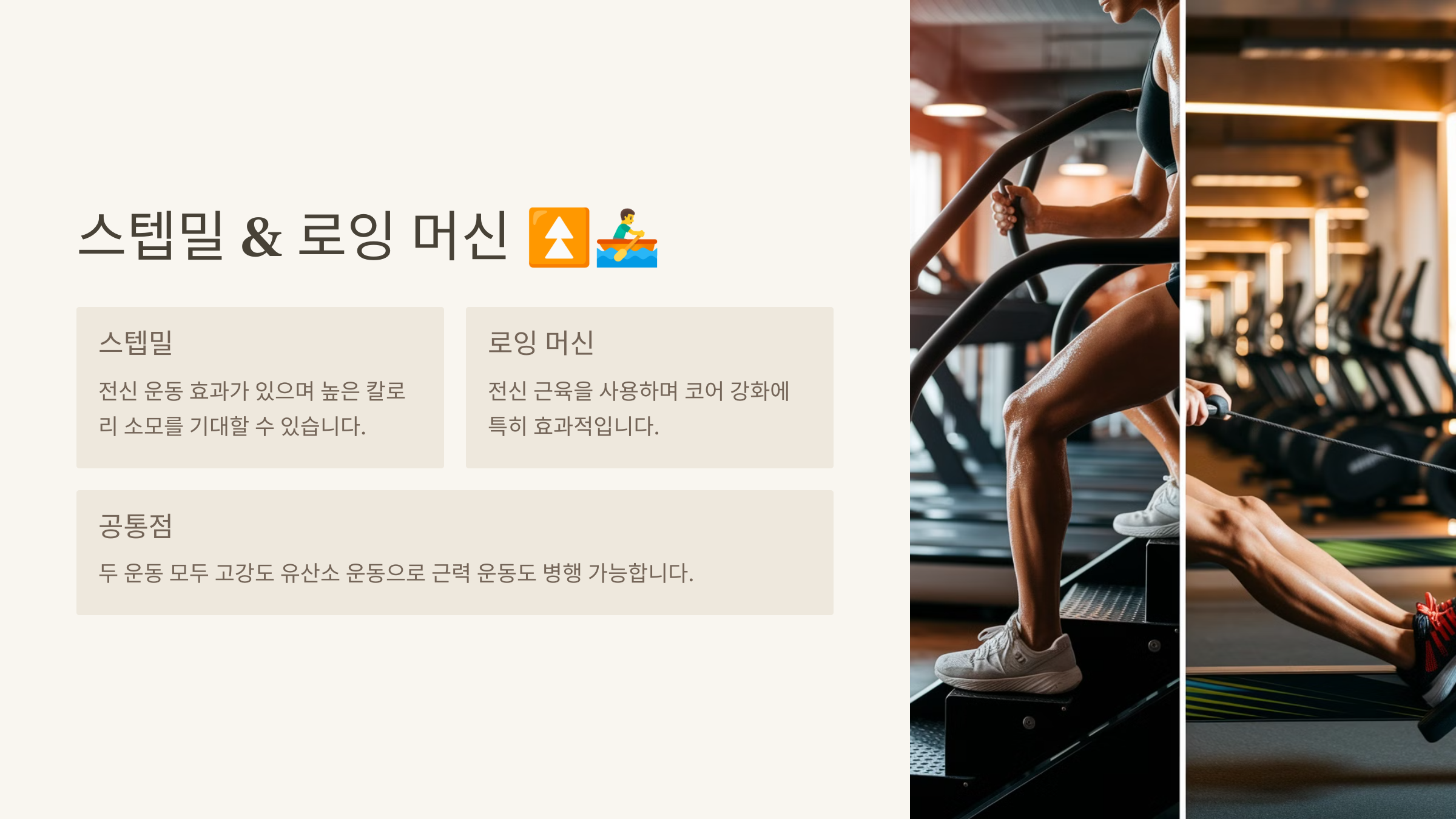 로잉 머신은 짧은 시간 내에 많은 칼로리를 소모할 수 있는 효율적인 운동이에요. 처음에는 천천히 연습하면서 바른 자세를 익히는 것이 중요해요. 😉