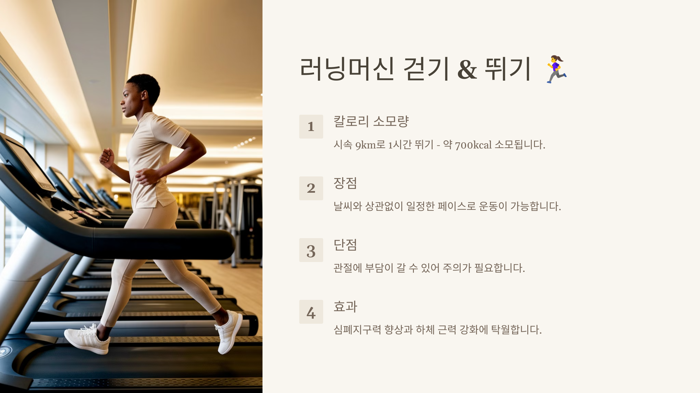 러닝머신을 할 때는 자세도 중요해요. 허리를 곧게 펴고, 팔을 자연스럽게 흔들면서 뛰어야 부상을 방지할 수 있어요. 또한 경사도를 조절하면 더 많은 칼로리를 소모할 수 있답니다! ⛰️