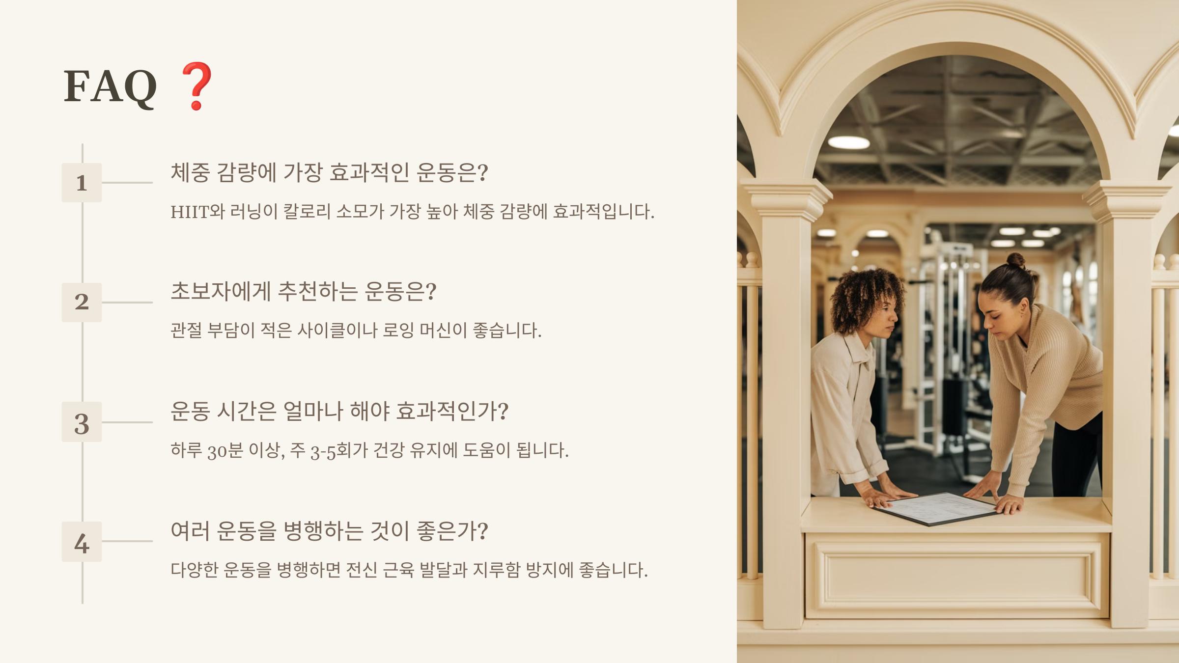 A1. 일반적으로 하루 30~60분 정도 유산소 운동을 하면 건강 유지와 체중 감량에 효과적이에요. 하지만 HIIT처럼 강도가 높은 운동은 15~20분만 해도 충분한 효과를 볼 수 있어요!