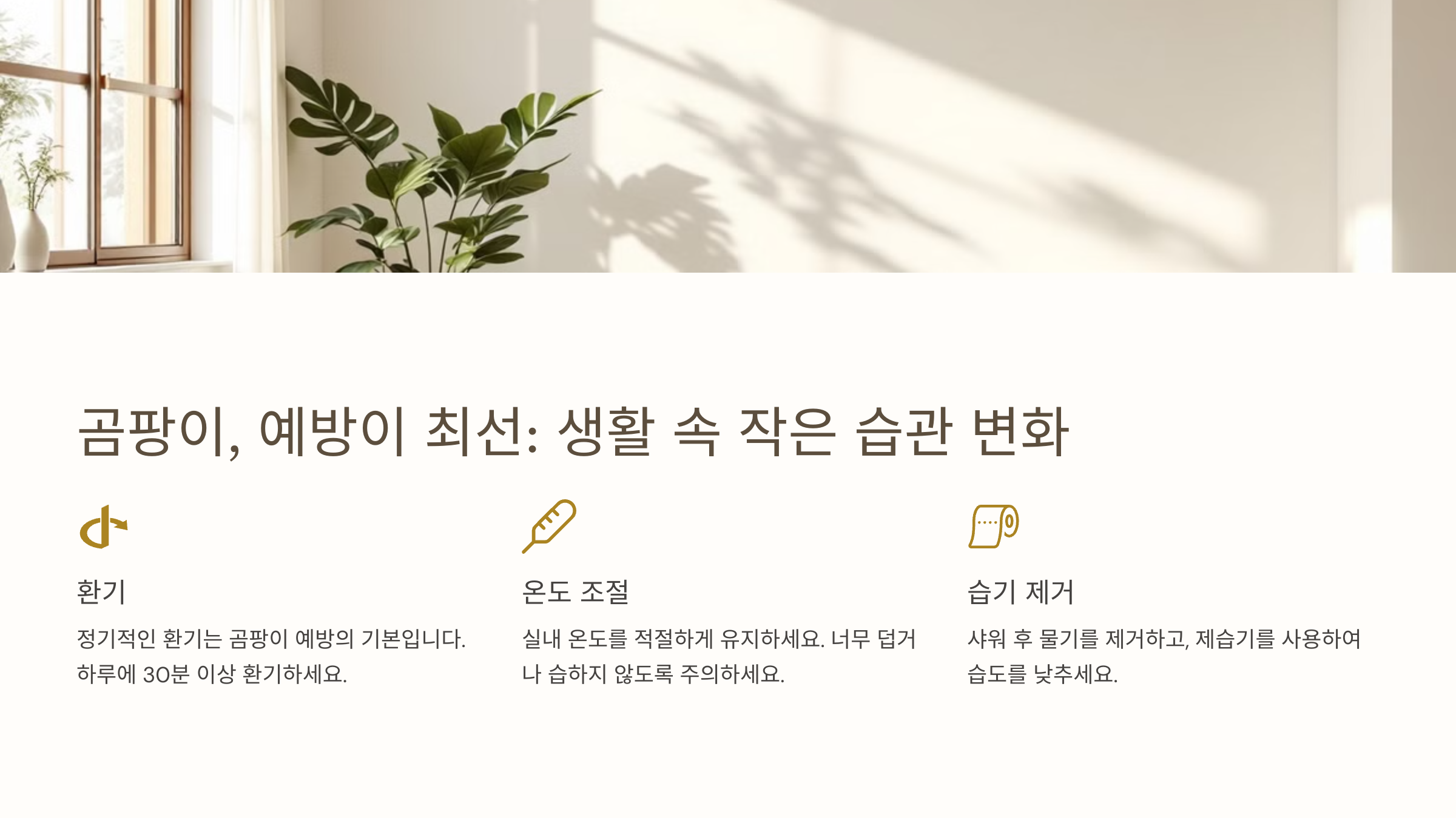 곰팡이를 제거하는 것도 중요하지만, 곰팡이가 아예 생기지 않도록 예방하는 것이 더 중요해요. 생활 속에서 습관을 조금만 바꿔도 곰팡이 걱정을 크게 줄일 수 있답니다! 😊