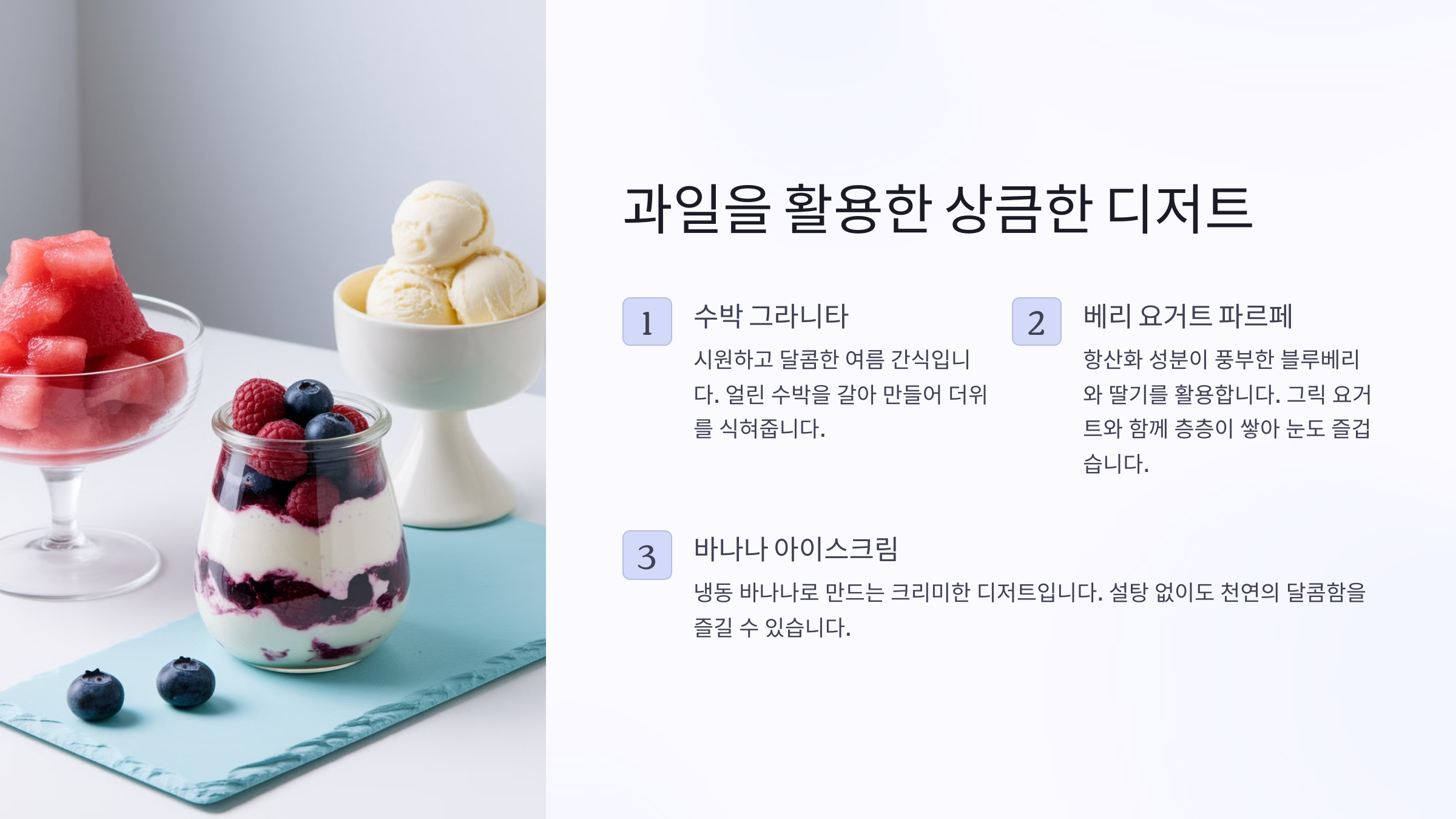 📌 다음 섹션에서는 견과류와 요구르트를 활용한 건강한 디저트를 소개할게요!