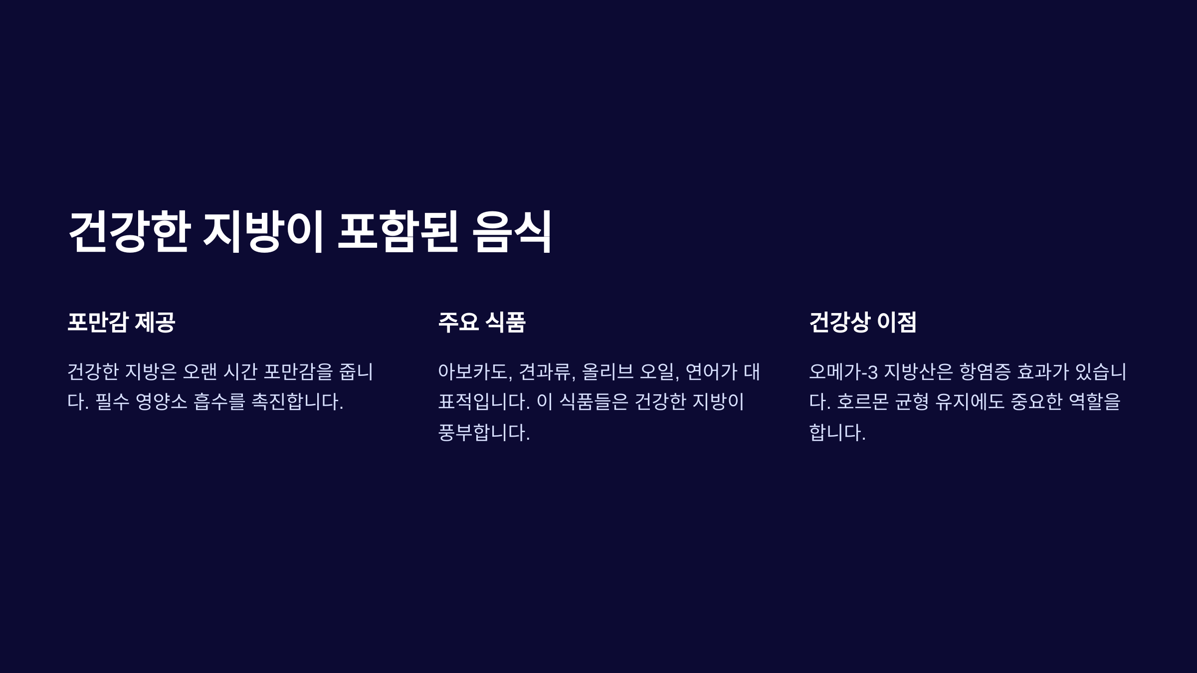 건강한 지방은 몸에 꼭 필요한 영양소로, 식욕 조절에 큰 도움을 줘요. 특히 불포화지방산은 포만감을 오래 유지해 주고, 혈당을 안정적으로 유지하는 역할도 해요.