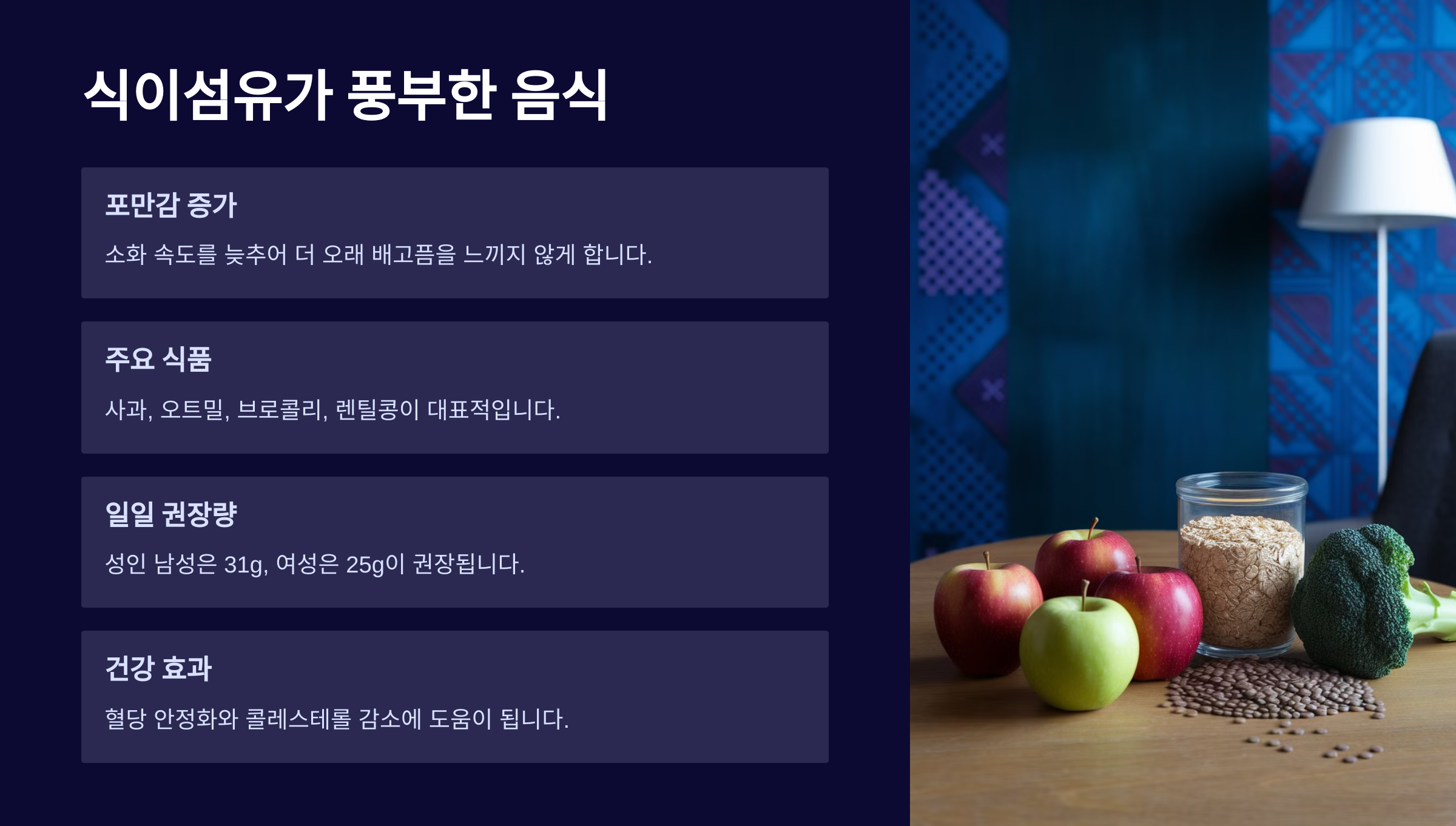 | 식이섬유 | 포만감 유지, 소화 속도 조절 | 귀리, 고구마, 사과 |