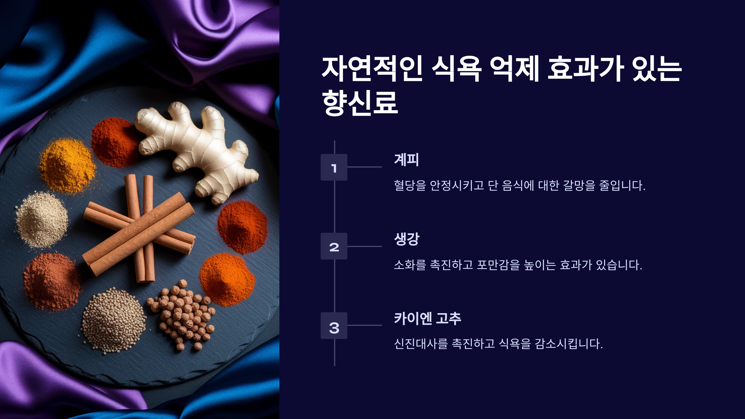 또한, 계피나 생강 같은 향신료는 혈당을 안정적으로 유지해 식욕이 갑자기 증가하는 것을 방지해요. 향신료를 요리에 적절히 활용하면 자연스럽게 식욕을 조절할 수 있어요.