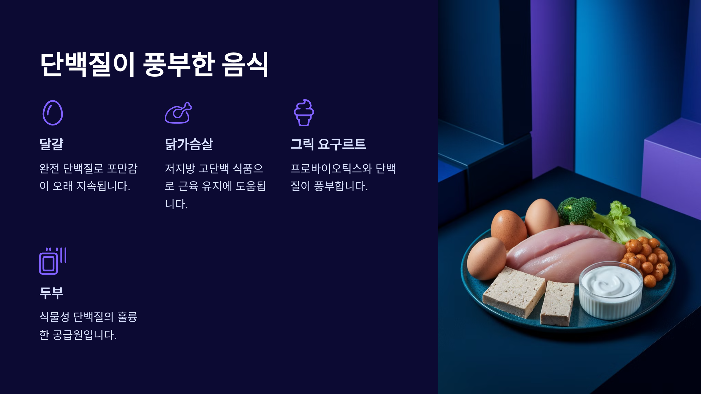 단백질이 풍부한 음식을 식사에 포함하면 자연스럽게 식욕이 줄어들고, 근육량을 유지할 수 있어요. 특히 운동 후 단백질을 섭취하면 몸이 회복되는 데도 도움이 돼요. 💪