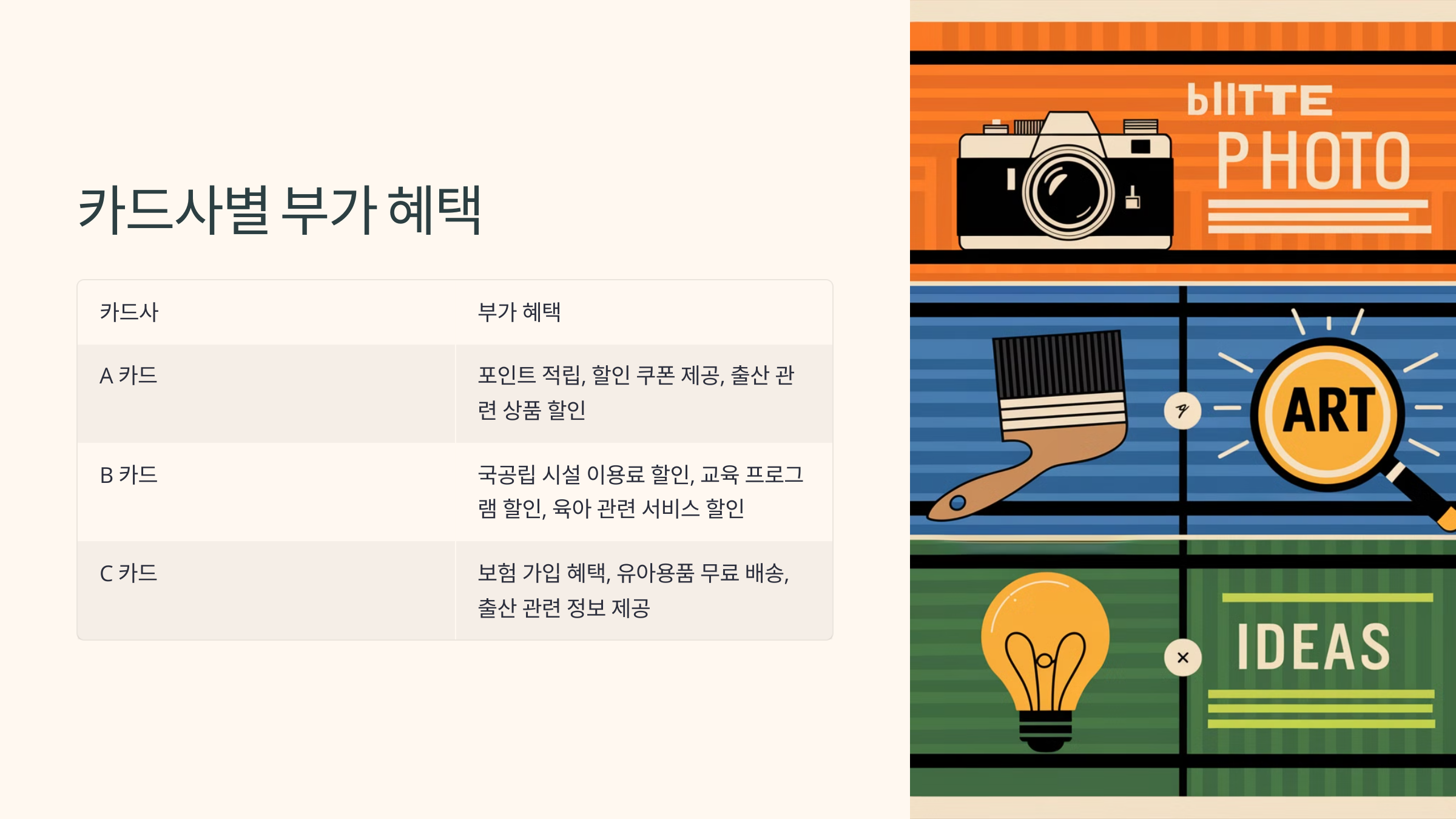✔ 카드 선택 TIP: - 병원과 약국 이용이 많다면 신한카드 - 대형마트, 온라인 쇼핑을 자주 한다면 KB국민카드 - 교육비 지출이 많다면 삼성카드 - 육아용품을 많이 구매한다면 롯데카드가 좋아요! 🎯