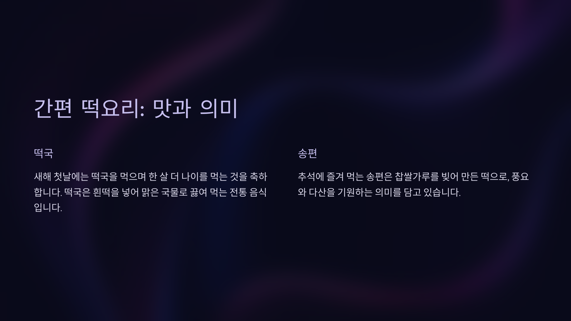 떡은 설 명절에 빠질 수 없는 음식이에요. 아래 간단한 떡요리를 활용해 손쉽게 명절 분위기를 살릴 수 있어요.