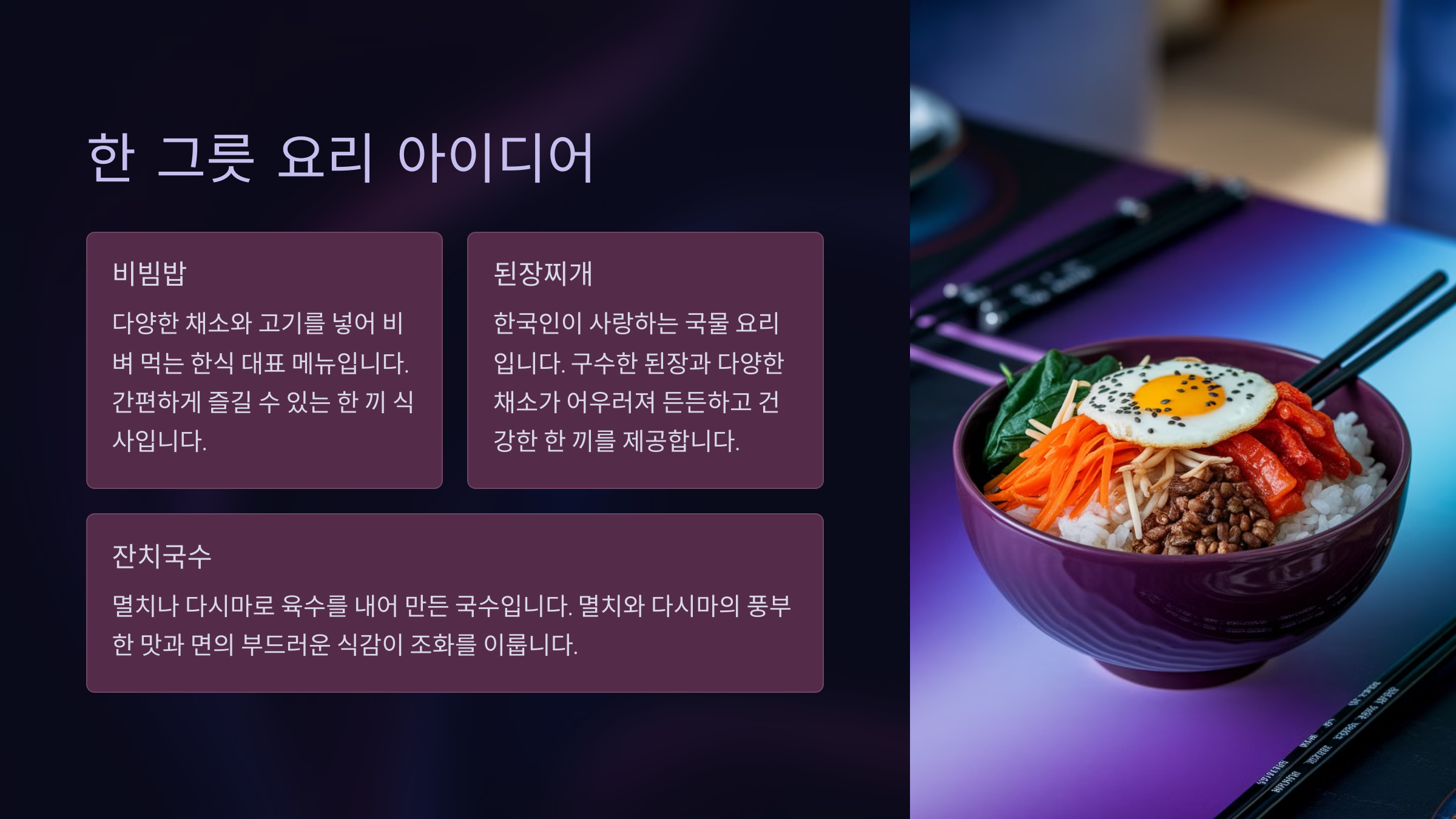 설날엔 가족들과 간편하게 나눌 수 있는 한 그릇 요리가 인기예요. 아래 메뉴를 참고해 보세요.