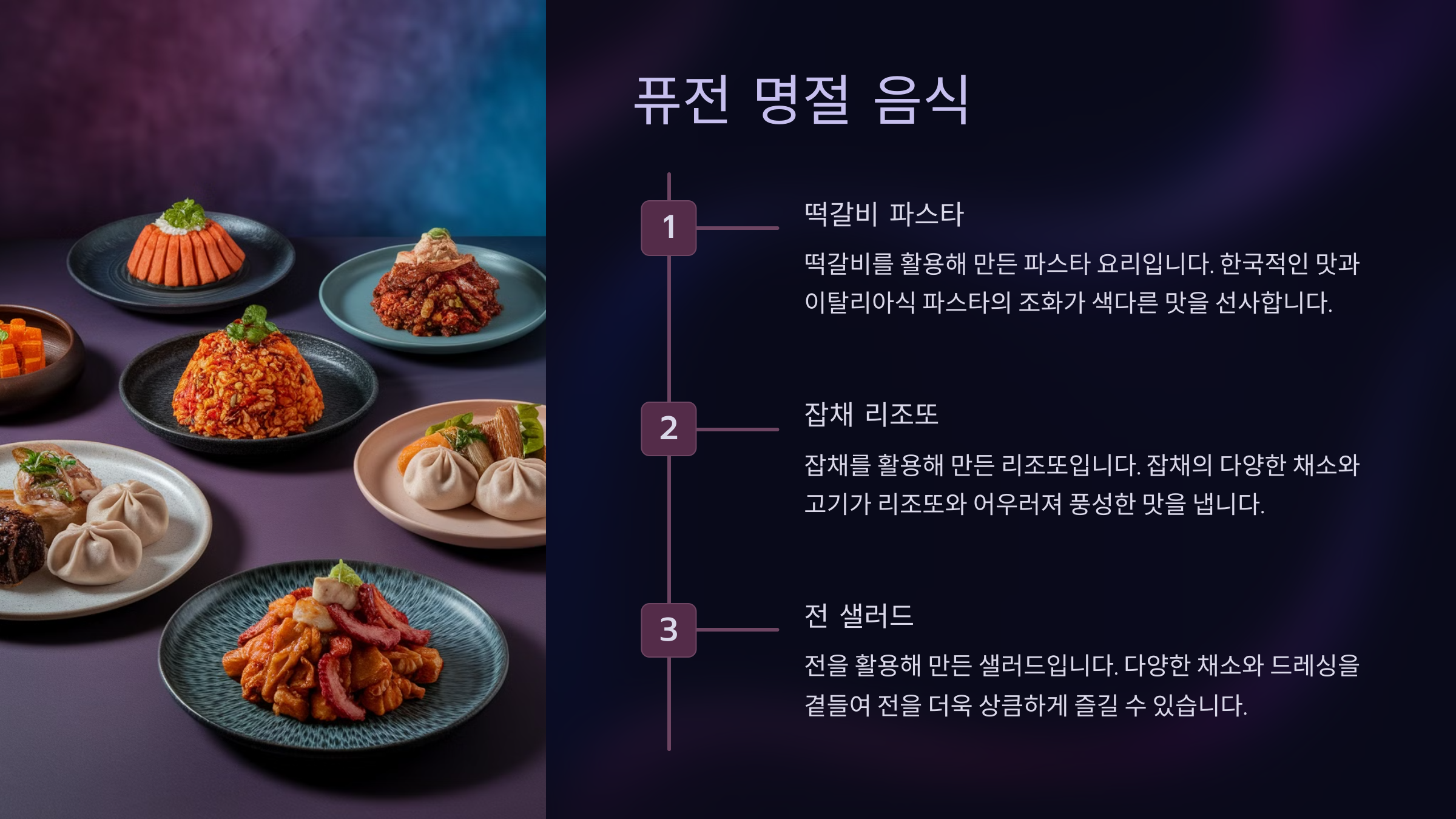 명절 음식도 현대적인 감각을 더하면 특별해져요. 퓨전 명절 음식을 시도해 보세요.