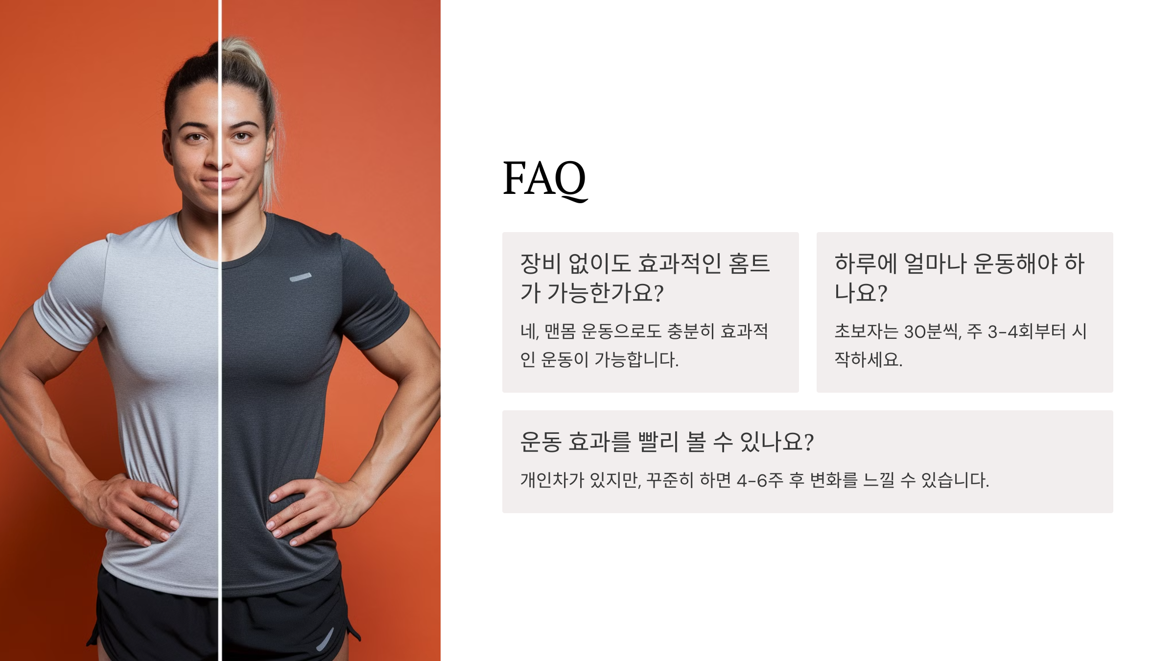 이제 홈트 초보자도 쉽게 따라 할 수 있는 방법을 모두 알았어요! 마지막으로 자주 묻는 질문(FAQ)을 정리해 볼게요. 궁금한 점이 있다면 확인해 보세요! 👇