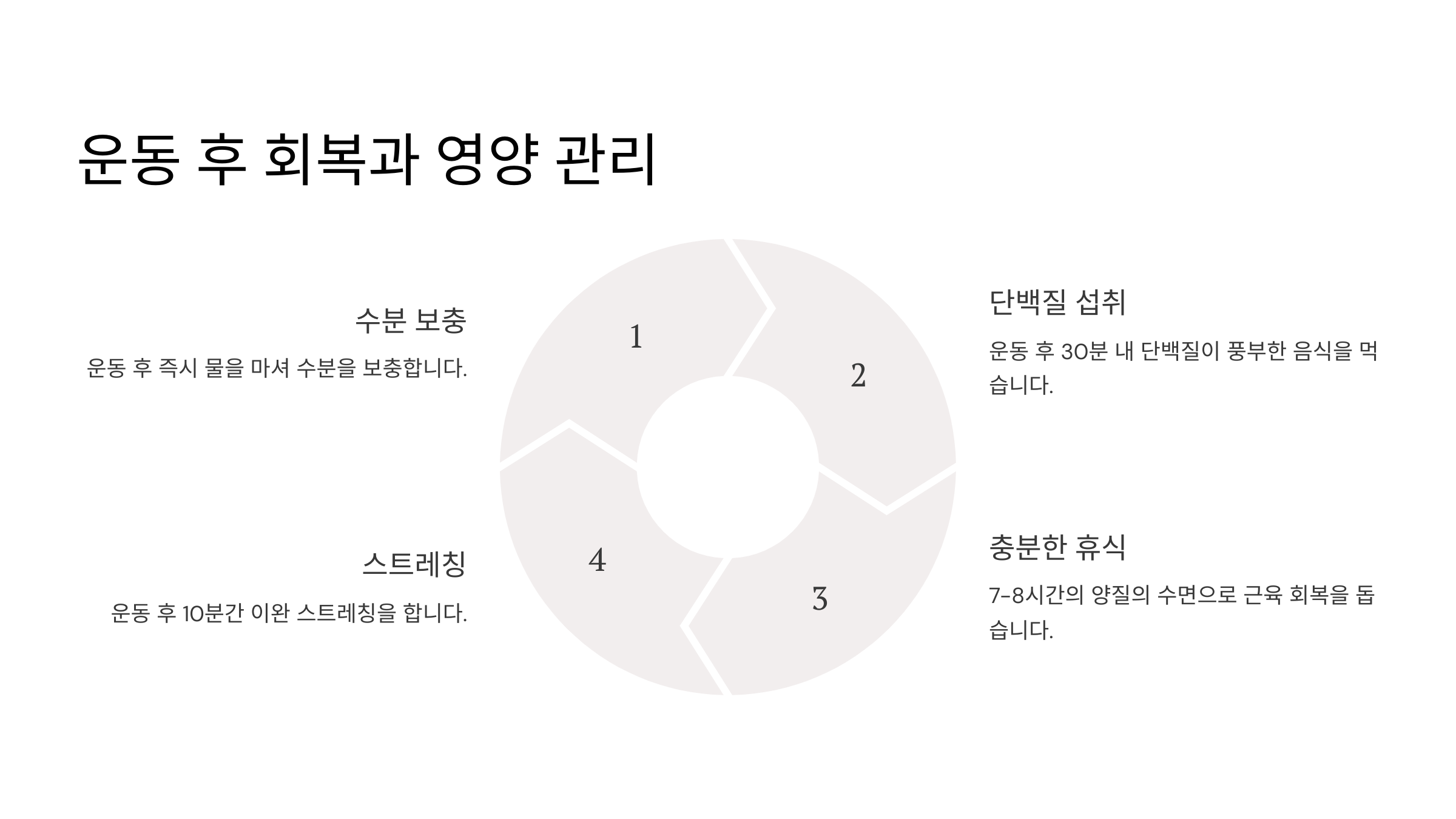 | 영양 관리 | 운동 후 단백질과 탄수화물 섭취 |