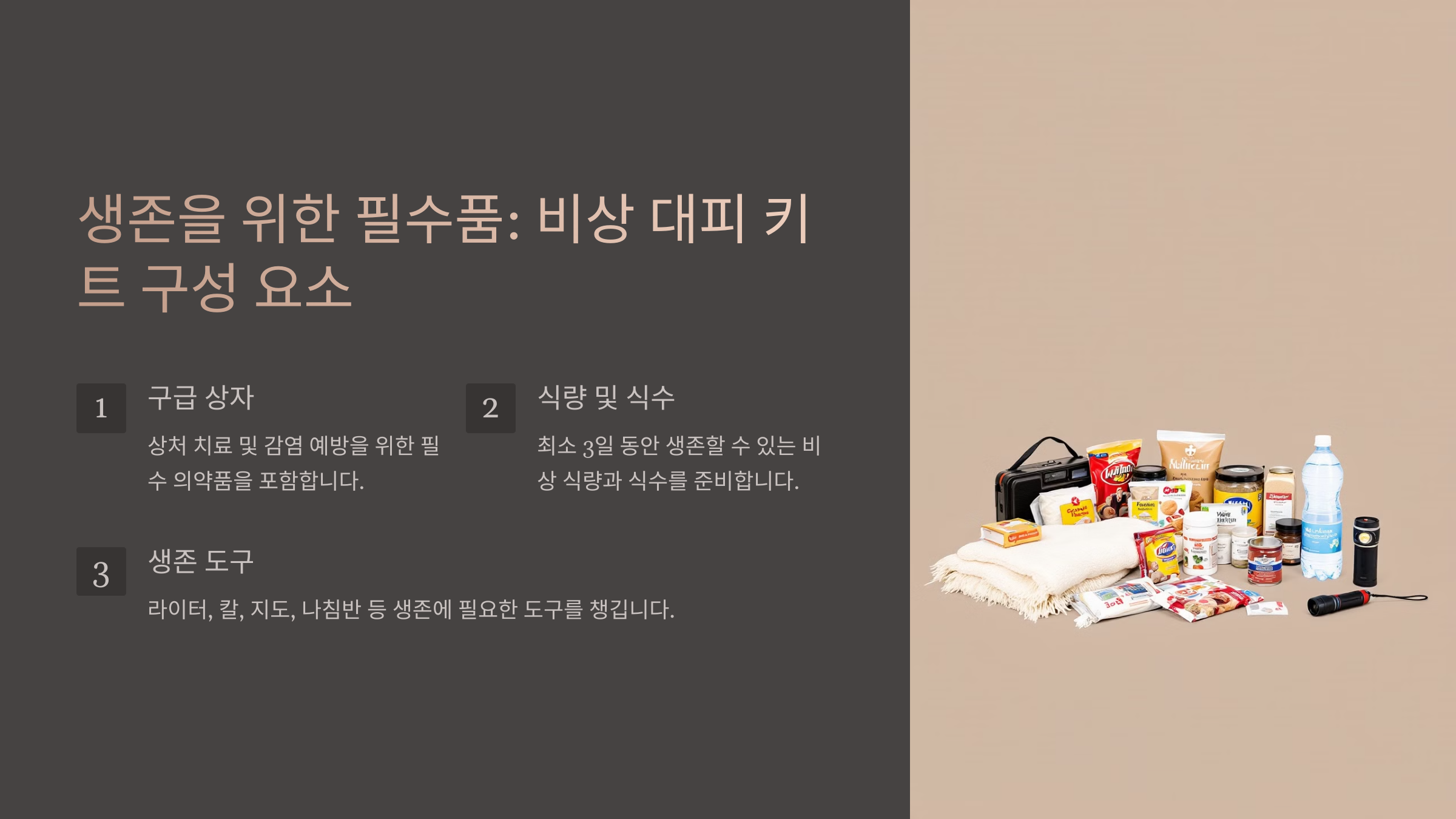 이런 상황에서 비상 키트가 없다면 생존이 어렵거나 대피가 늦어질 수 있어요. 이제 필수 구성품을 살펴볼까요? 🎒