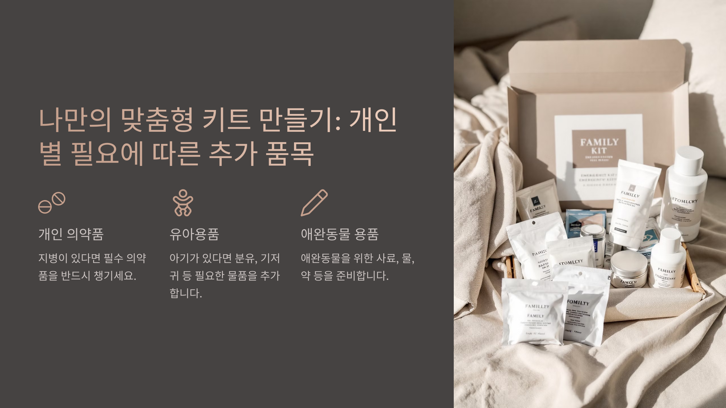 비상 키트는 기본 구성 외에도 가족 구성원, 건강 상태, 거주 환경에 따라 맞춤형으로 준비하는 것이 좋아요. 🚑