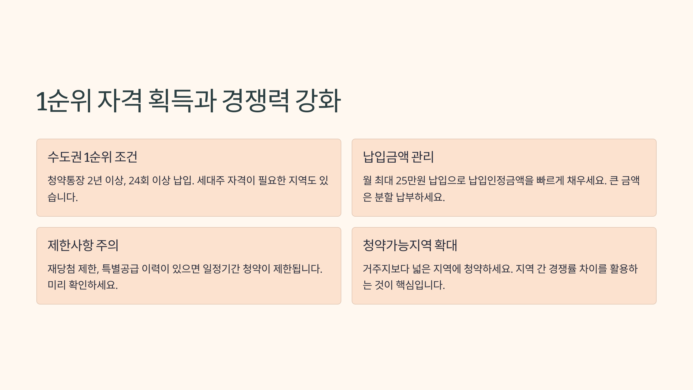 특히 청약 경쟁이 높은 서울, 수도권에서는 1순위 요건을 갖추는 것이 기본이에요. 무주택 상태를 유지하면서, 청약통장 납입을 꾸준히 하는 것이 핵심 전략이에요. 💡