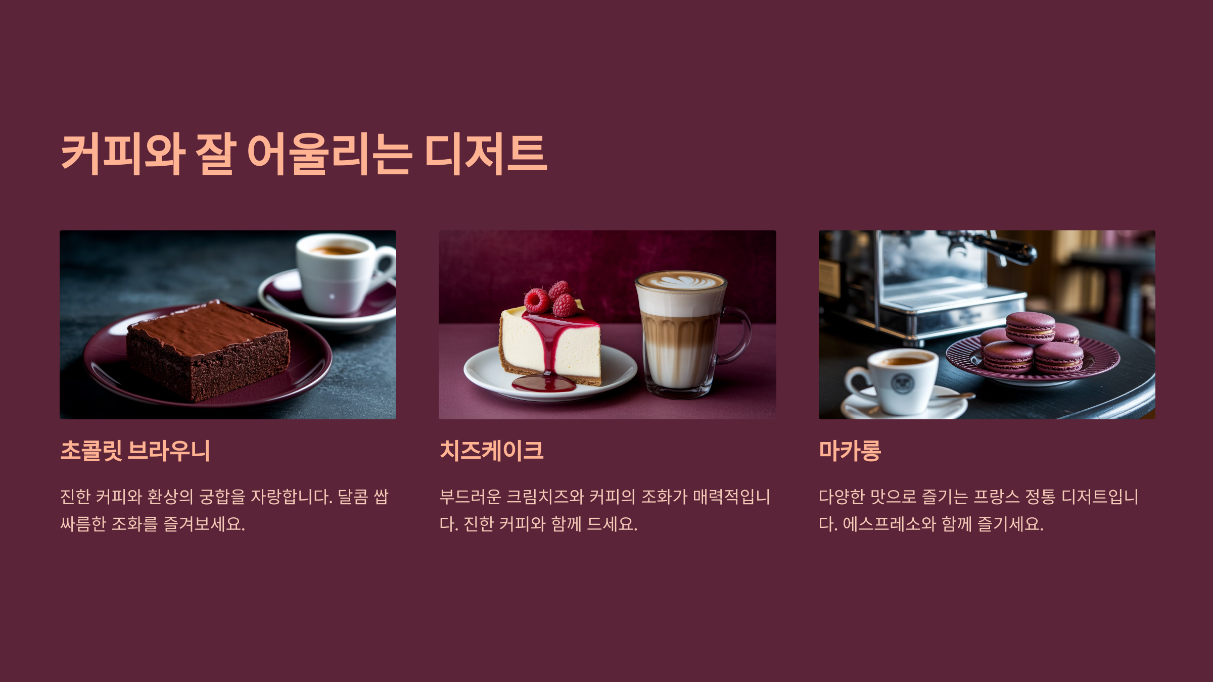 | 디저트 | 주요 재료 | 어울리는 커피 |