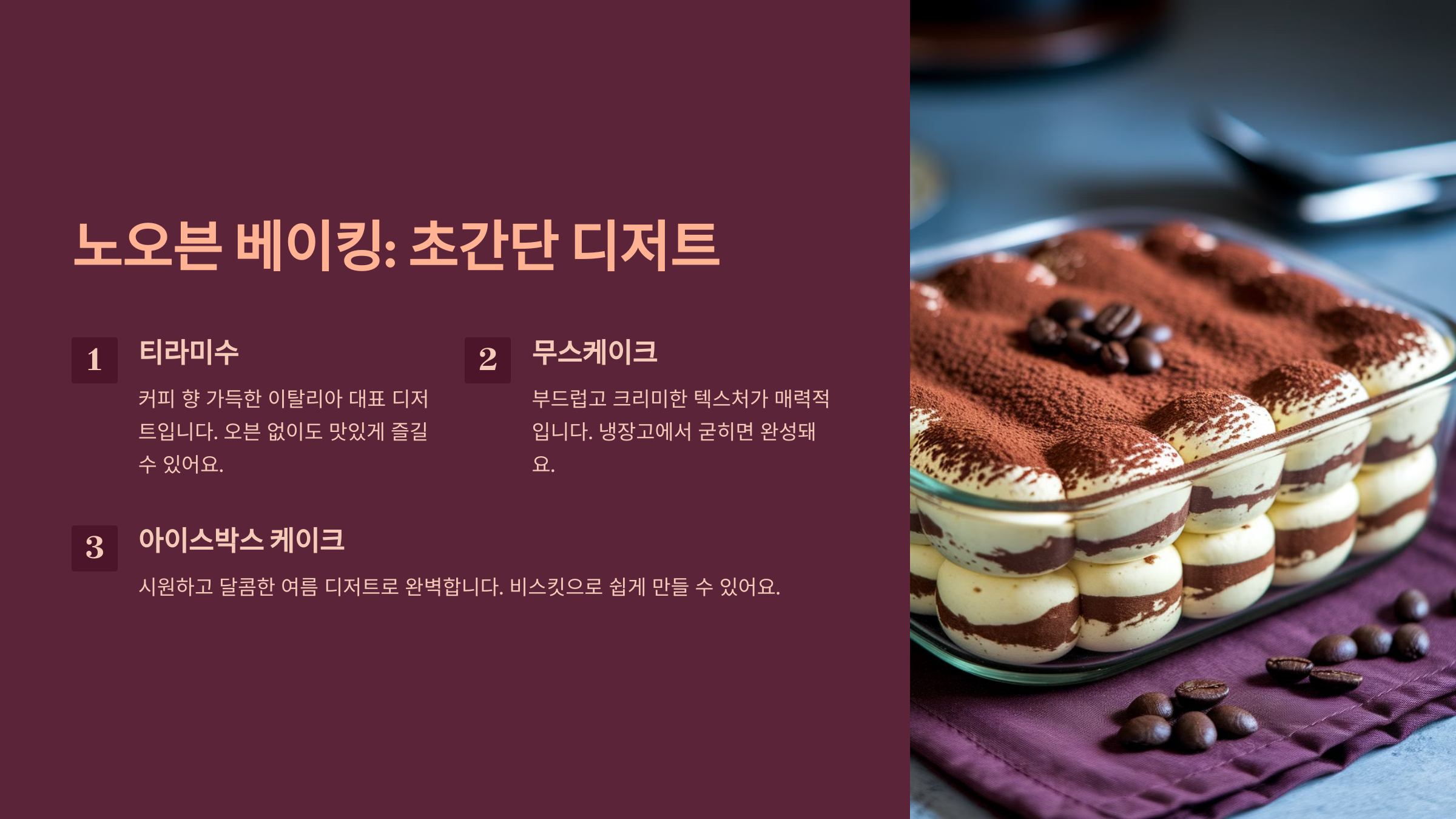 | 초간단 티라미수 | 마스카포네 치즈, 에스프레소, 카스텔라 | 재료 층층이 쌓고 냉장 | 30분 + 냉장 2시간 |