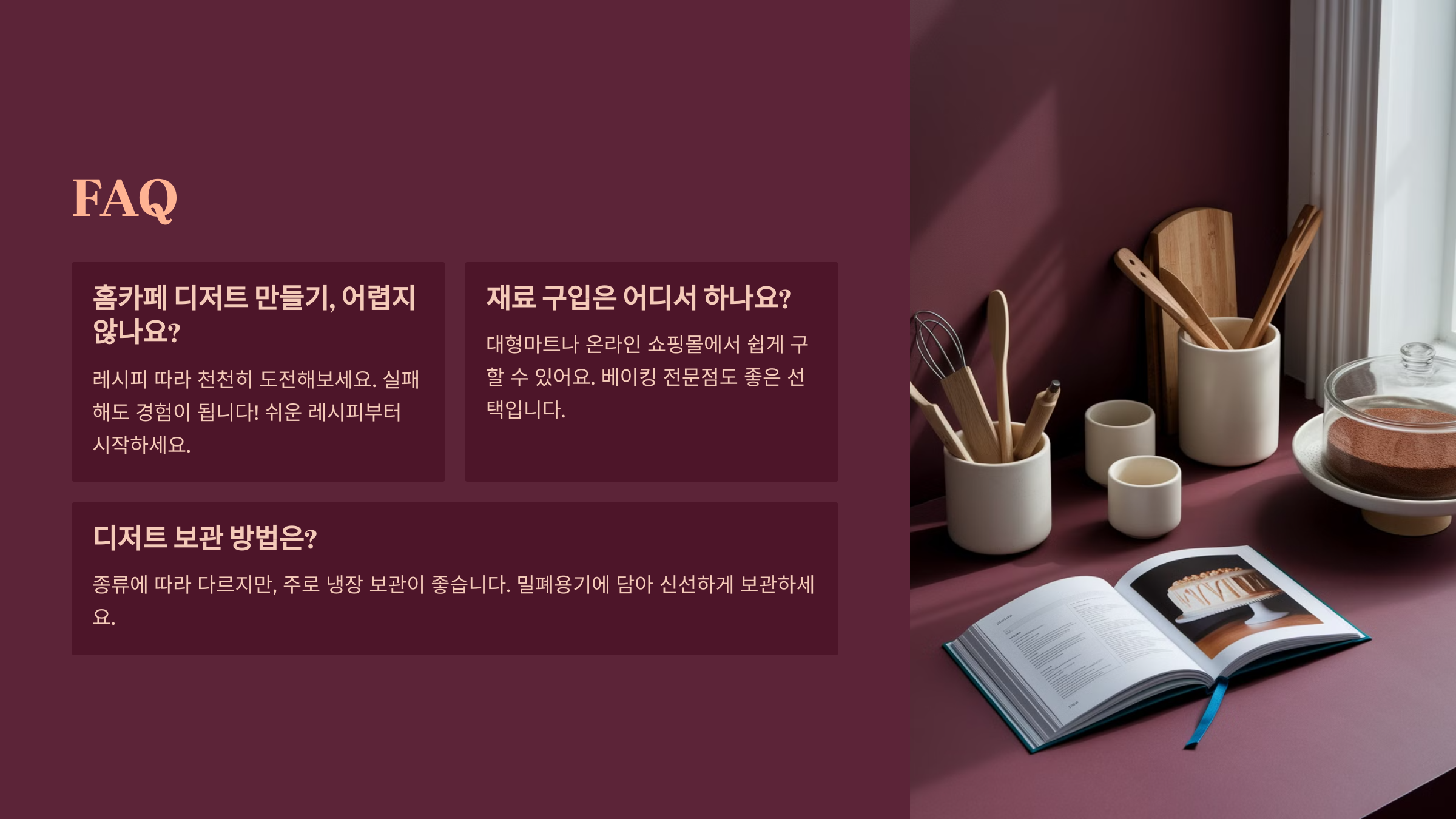 이제 홈카페 디저트에 대한 모든 걸 알아봤어요! 마지막으로 자주 묻는 질문(FAQ)을 살펴볼까요? 🤔