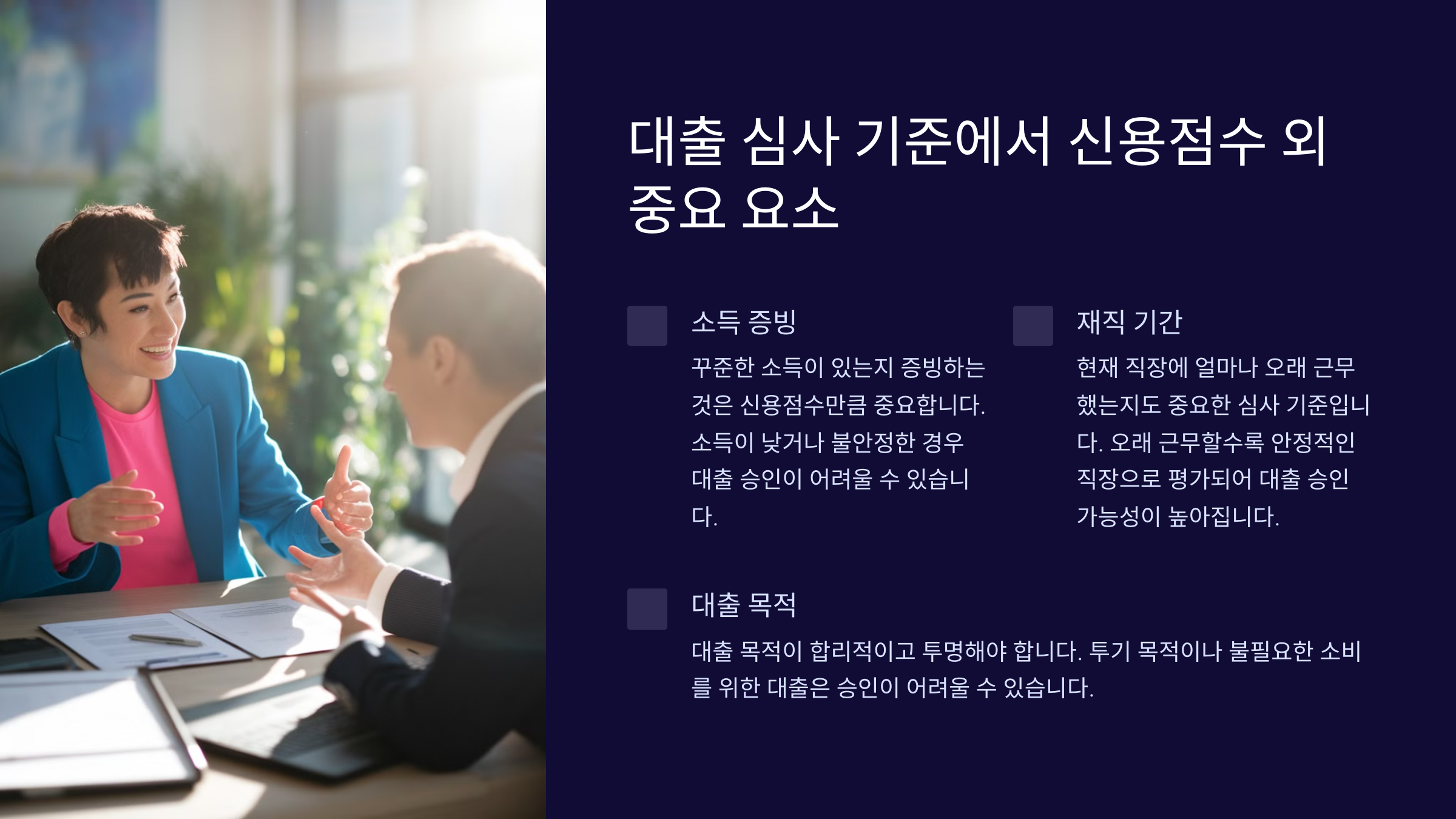 | 소득 안정성 | 매우 중요 | 고정 소득이 높을수록 유리 |