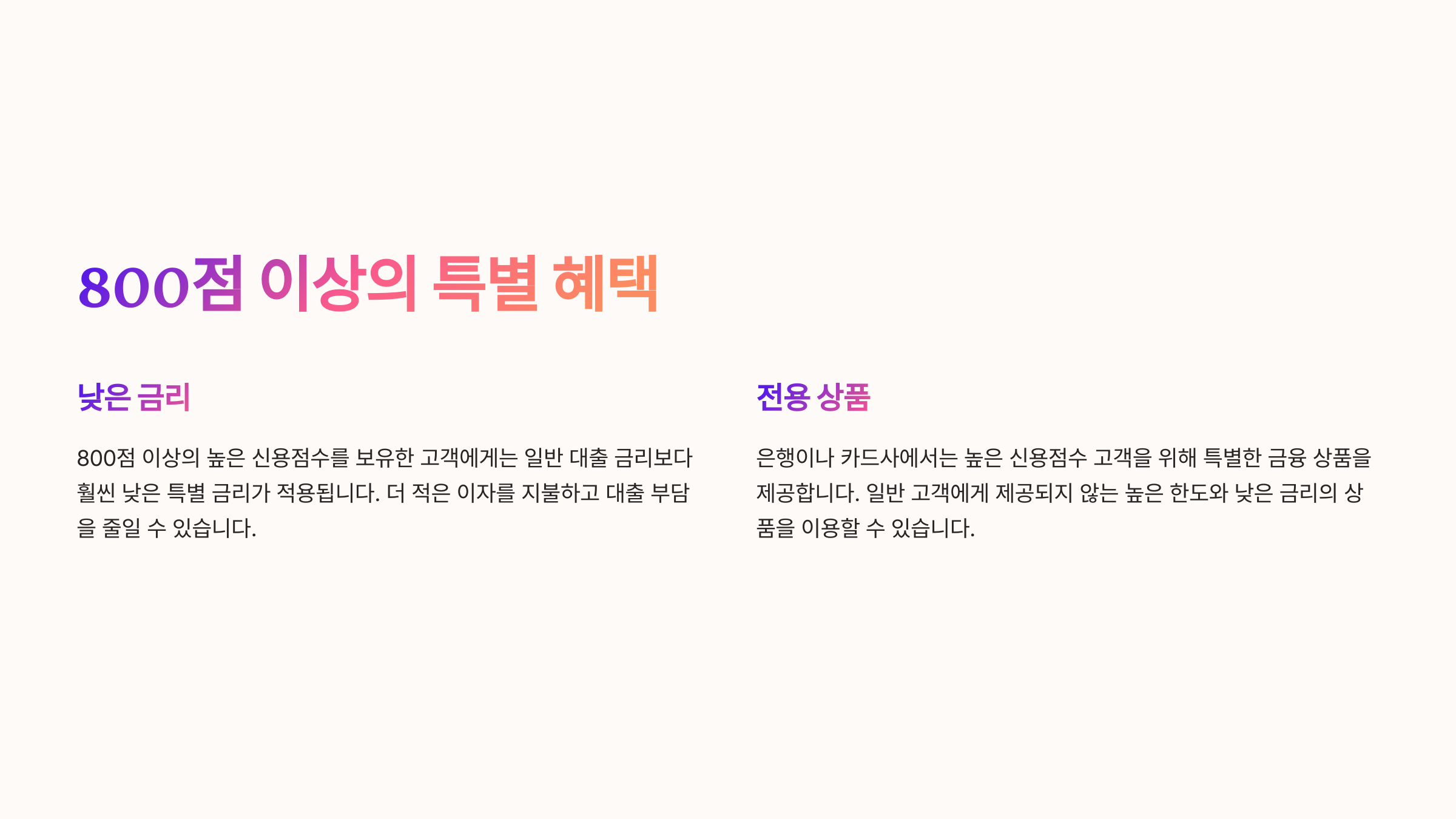 이처럼 신용점수를 100점만 올려도 대출 이자 부담을 크게 줄일 수 있어요! 💰 다음으로, 신용점수 800점 이상이면 받을 수 있는 특별 금융상품을 알아볼까요? 👇