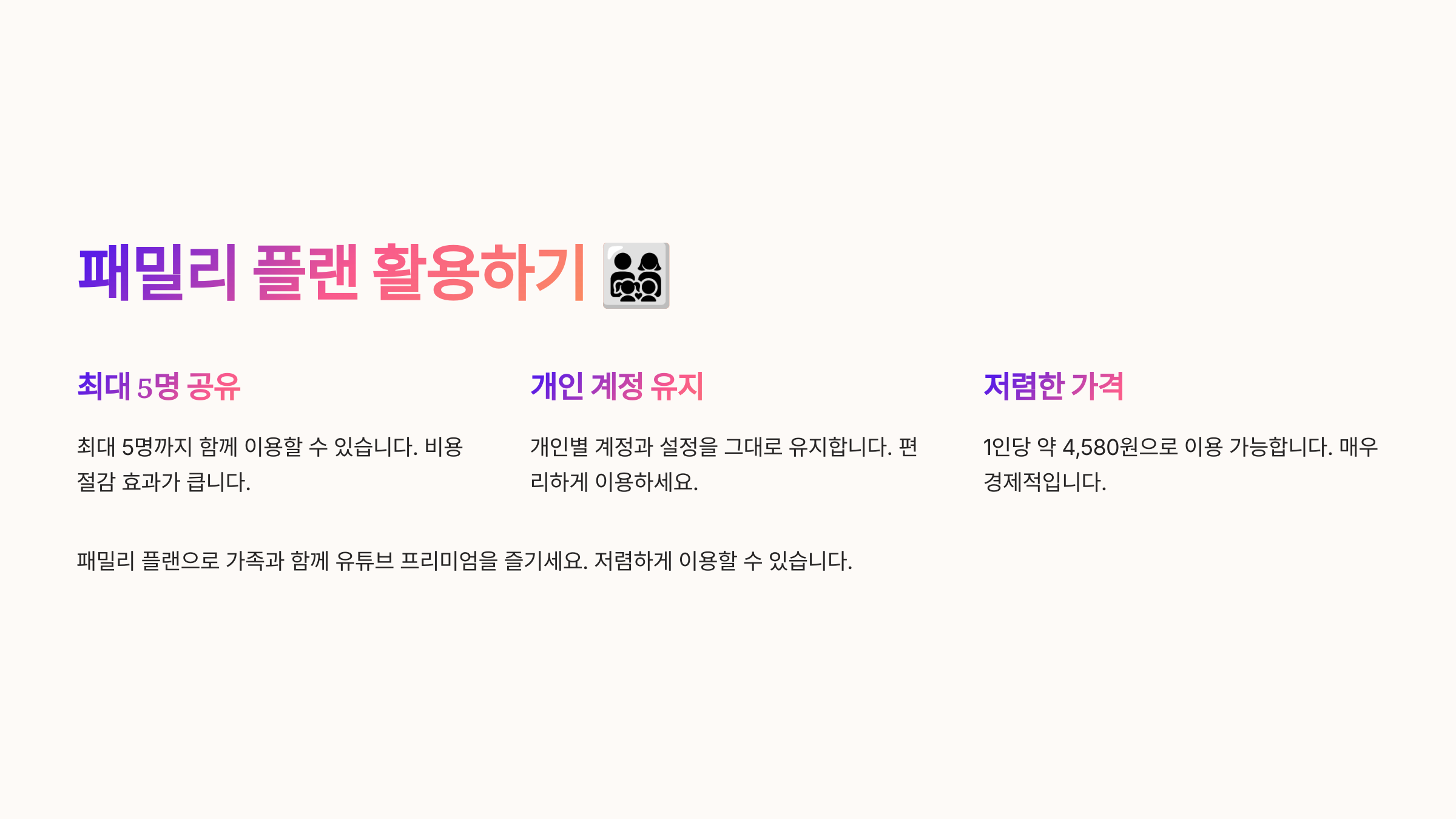 패밀리 플랜을 사용하면 한 달에 22,900원을 내고 최대 6명이 사용할 수 있어요. 즉, 한 명당 3,800원만 내면 되니 훨씬 저렴하죠! 🙌