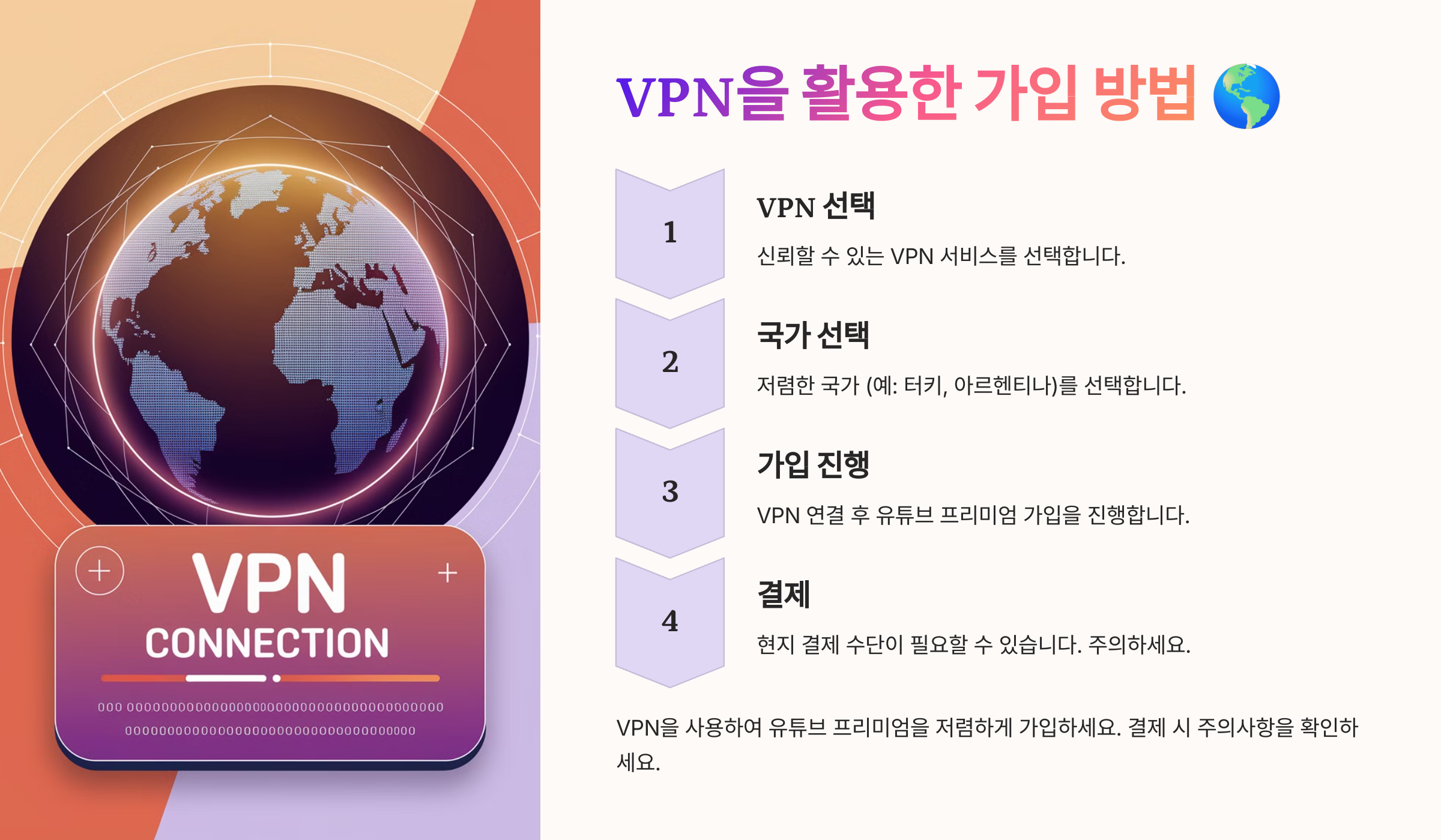 1. VPN을 사용해 가입할 경우, 결제 수단이 현지화된 카드여야 할 수도 있어요.