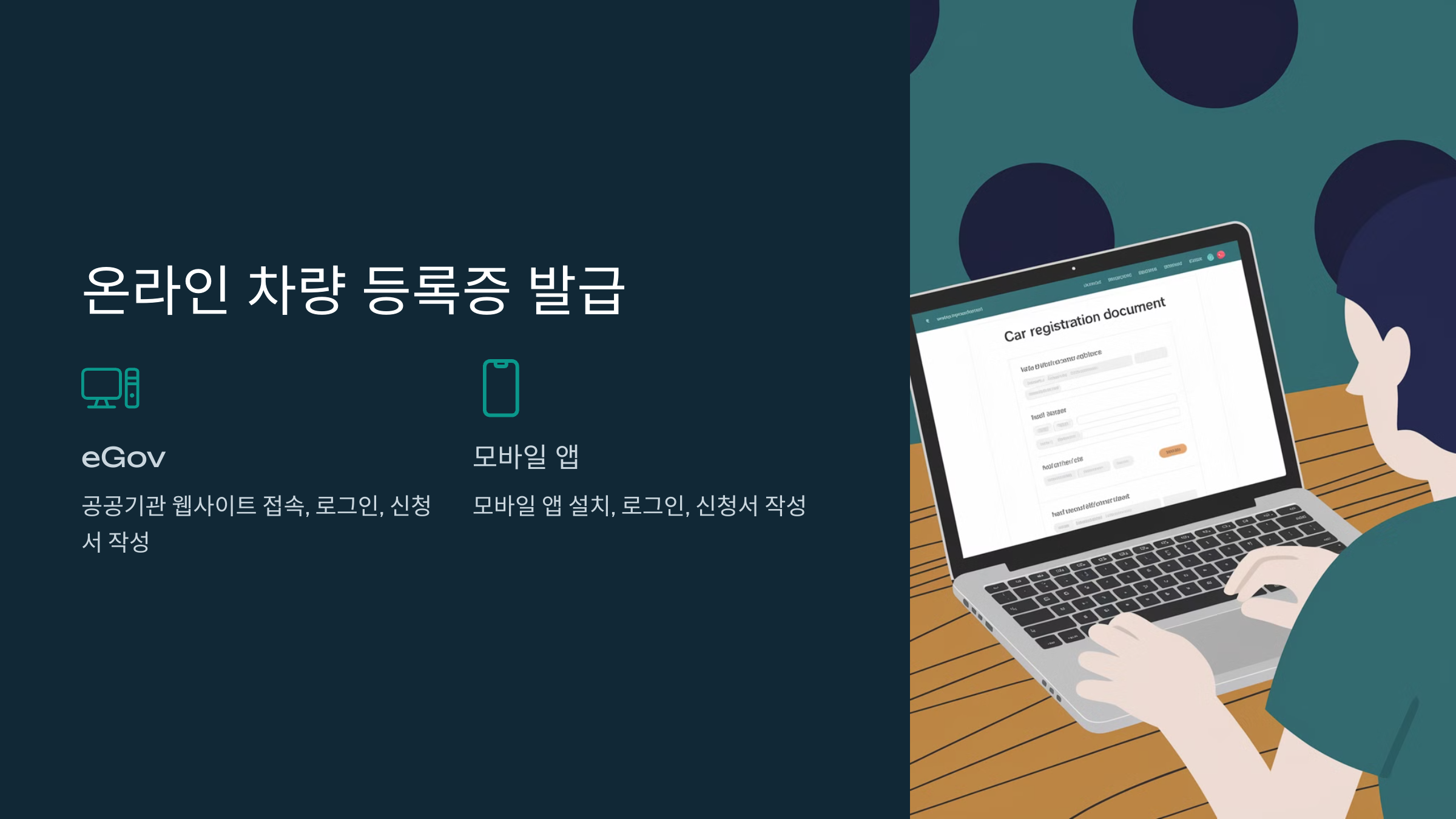 메인 화면에서 차량 등록증 발급 메뉴를 찾아 신청서를 작성하세요.