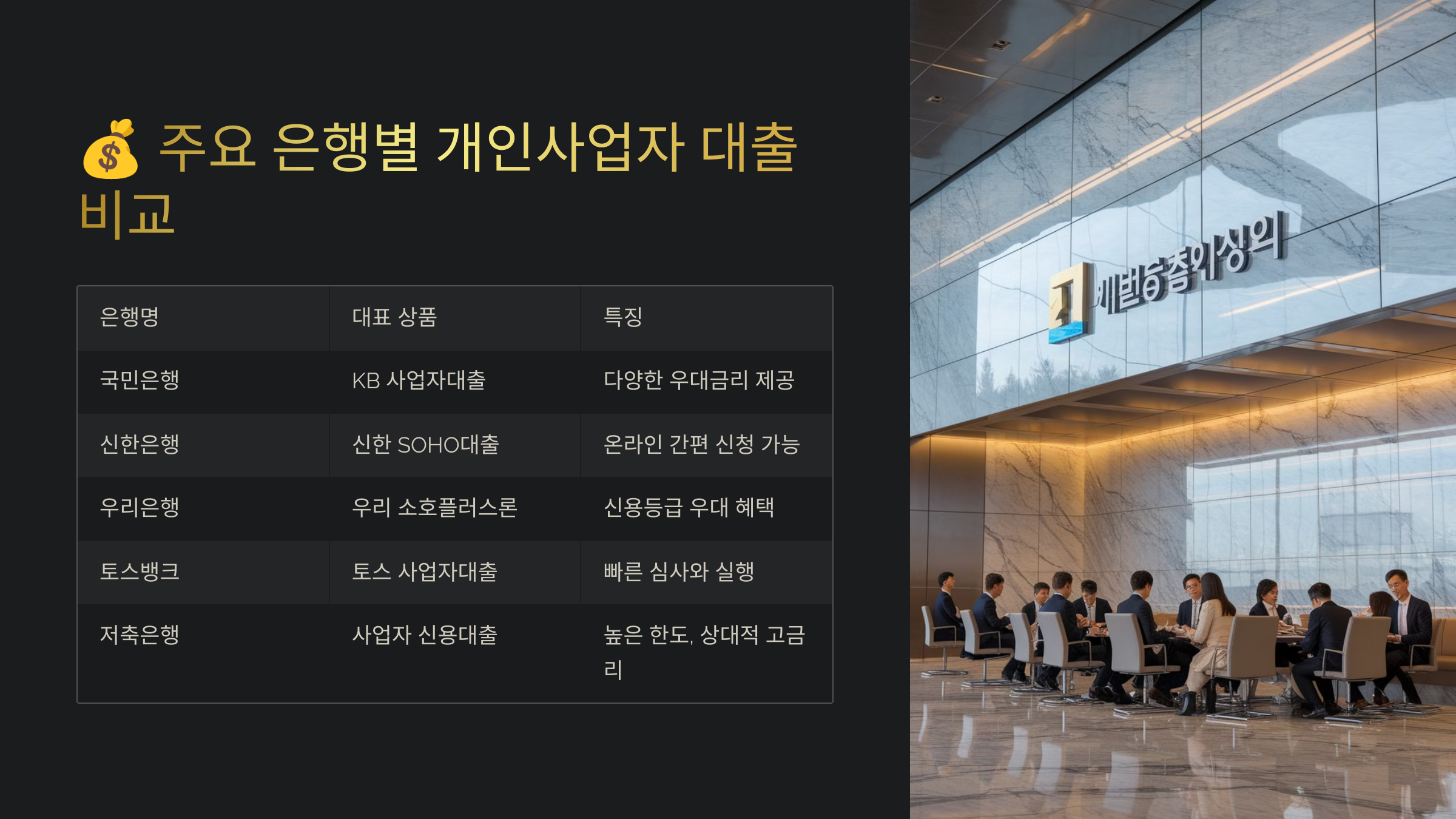 개인사업자는 운영자금을 마련하기 위해 대출이 필요한 경우가 많아요. 하지만 은행마다 조건이 다르고, 대출 종류도 다양해서 어떤 상품이 내게 적합한지 고민될 수밖에 없죠.