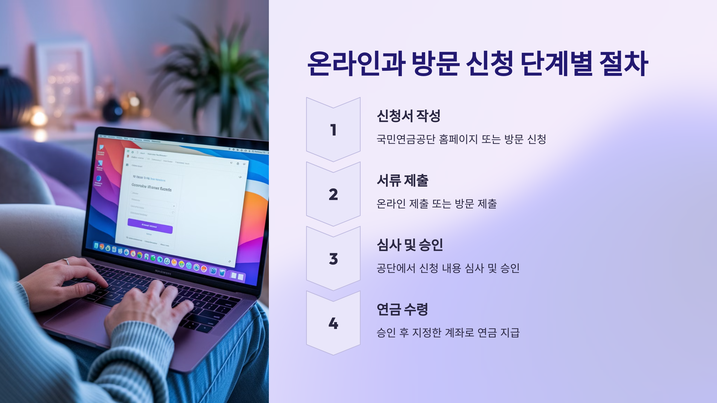 국민연금 신청은 온라인과 방문 신청 두 가지 방법이 있어요. 본인에게 편한 방법을 선택하면 돼요.