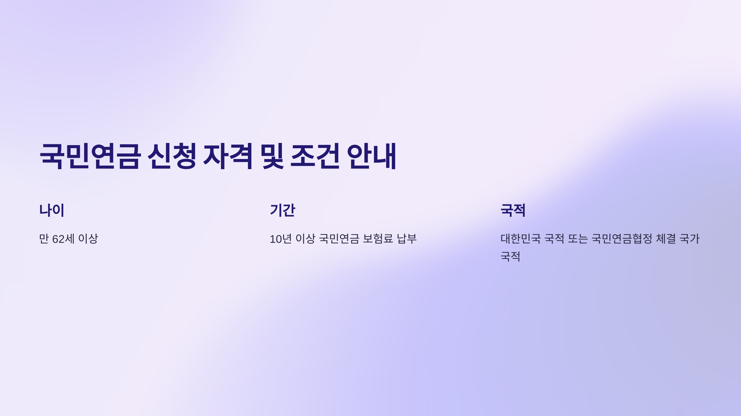 국민연금 신청 자격은 기본적으로 연령과 납부 기간에 따라 달라져요. 연금 수령을 위해서는 최소한 10년 이상 보험료를 납부해야 하며, 연령 조건을 충족해야 해요.