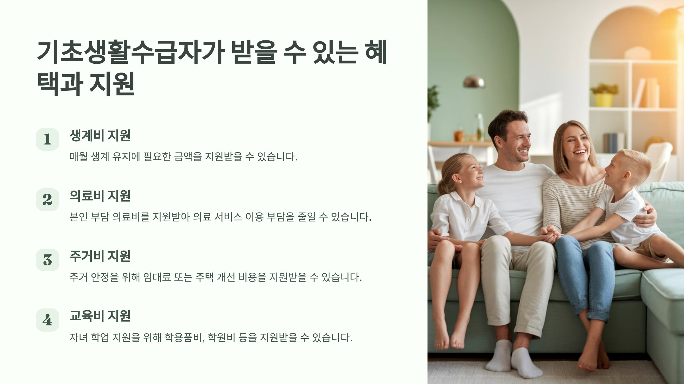 기초생활수급자로 선정되면 다양한 복지 혜택을 받을 수 있어요.