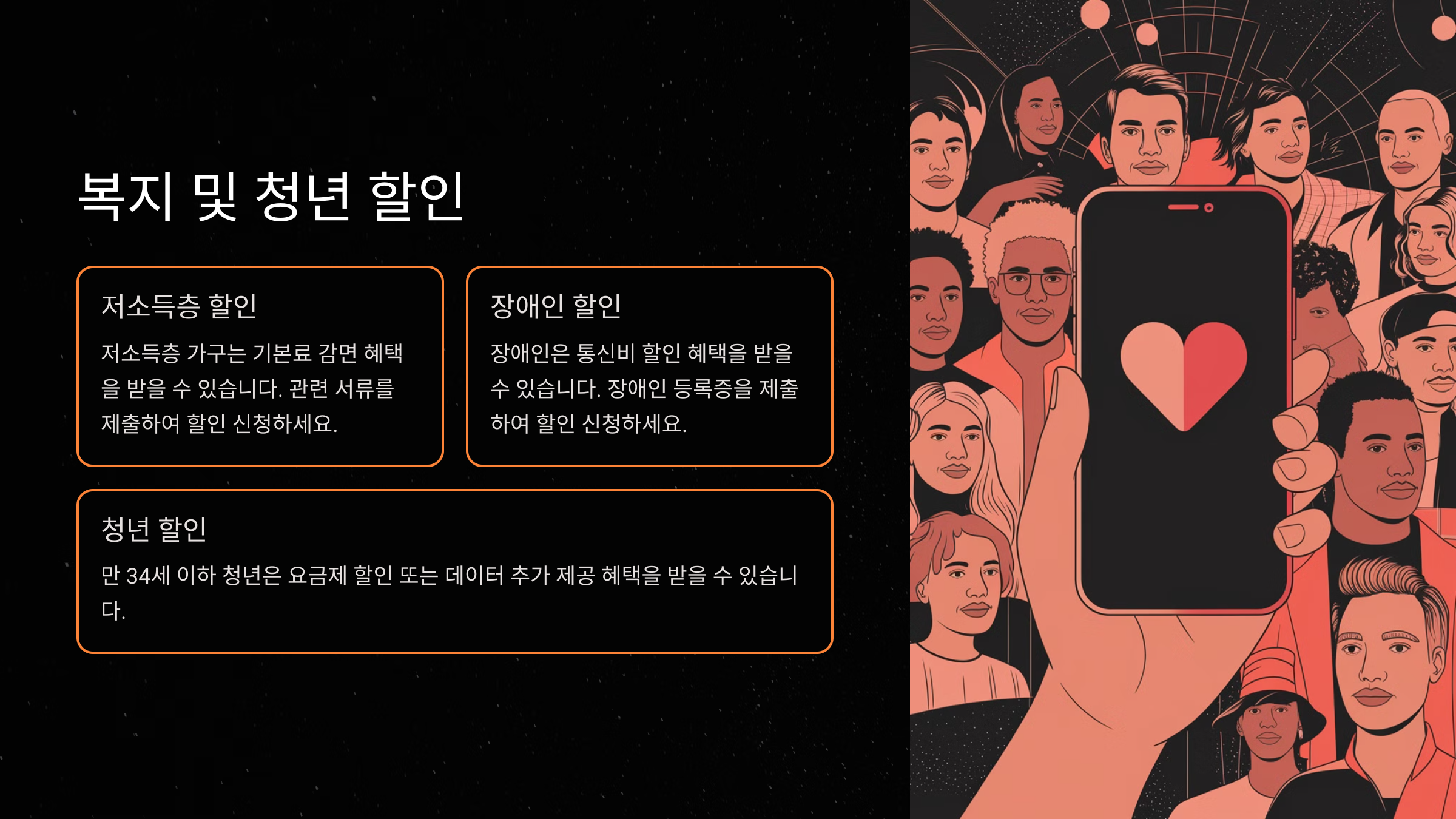 정부와 통신사에서는 사회적 배려 계층을 위해 다양한 통신비 지원 프로그램을 운영하고 있어요. 만 24세 이하 청년, 기초생활수급자, 장애인, 국가유공자 등은 특별 할인을 받을 수 있어요.