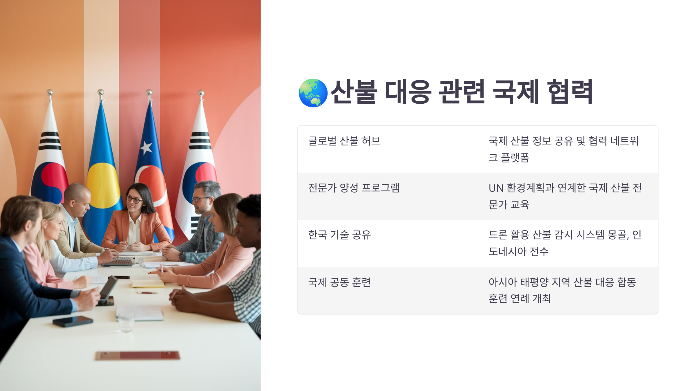 산불은 국경을 넘는 재난이에요. 특히 기후 변화로 인해 세계 각국이 산불 위협에 놓이면서, 국제 협력의 중요성이 점점 커지고 있어요. 우리나라도 단독으로 대응하기보다는 주변국 및 국제기구와 협력해 산불 대응 시스템을 고도화하고 있답니다.