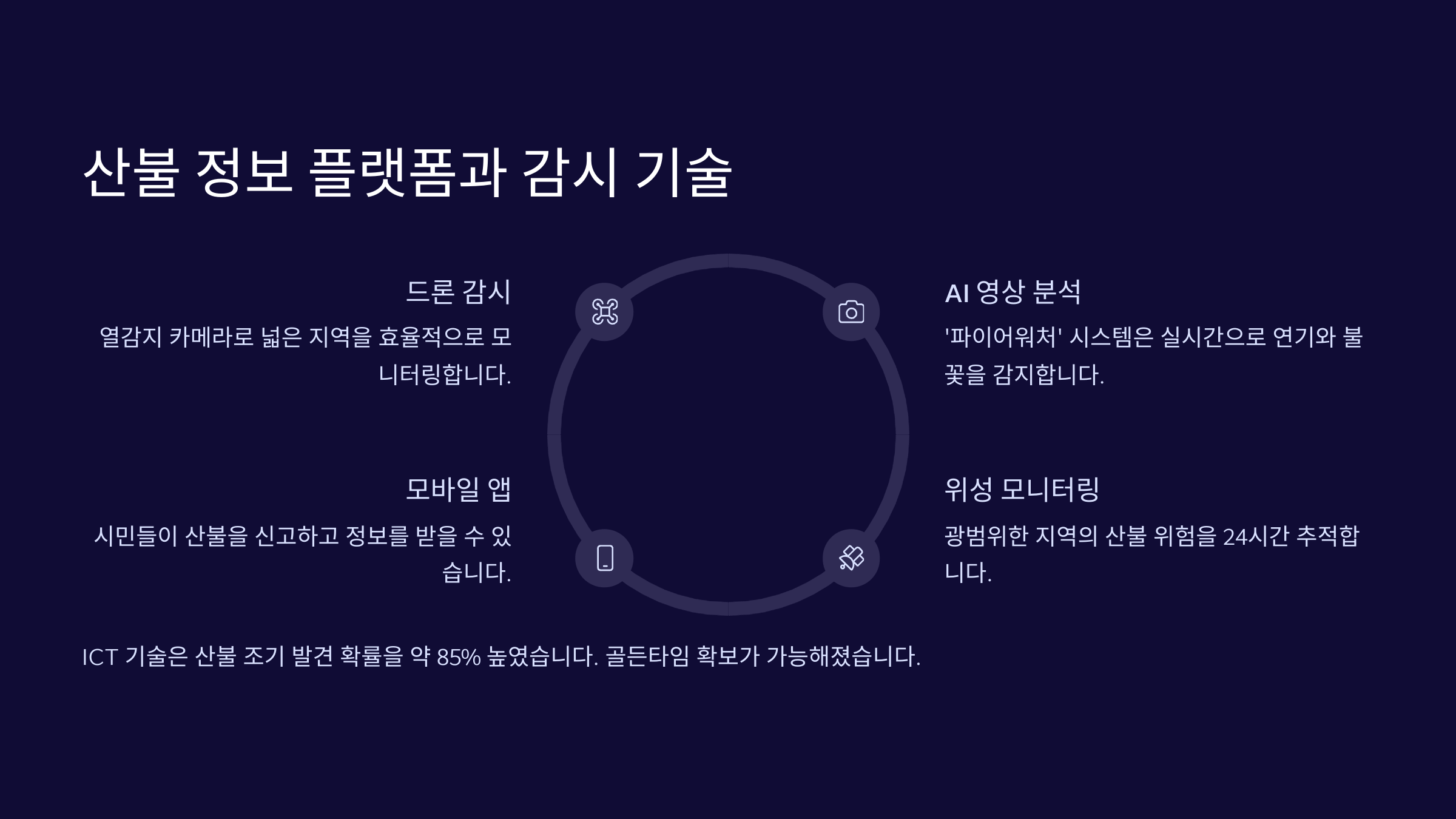 | 드론 감시 | 고지대/넓은 지역 모니터링 | 강원도, 제주 | 산불 조기 감지율 75% 증가 |