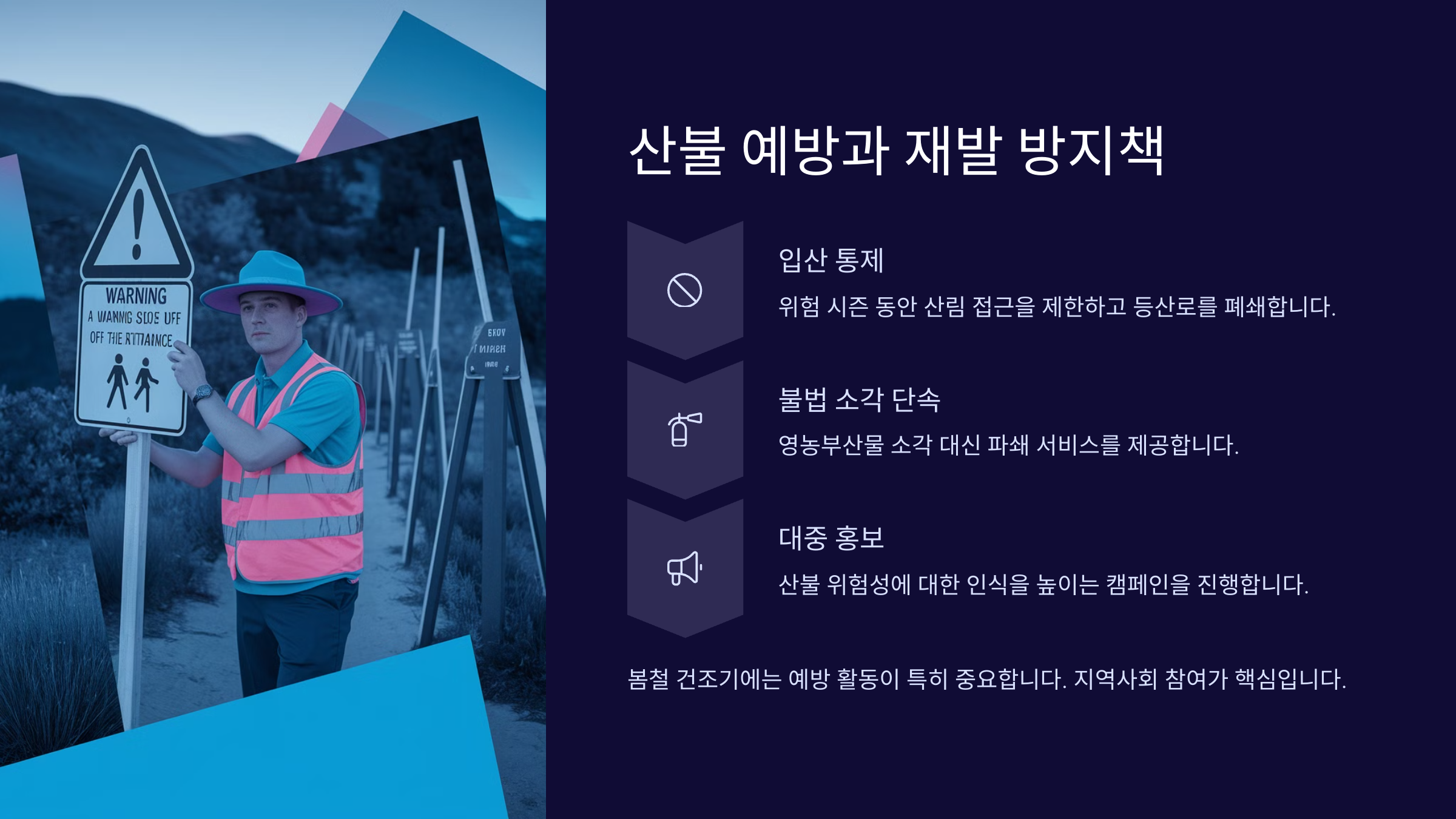 산불을 막기 위한 제도적 장치는 '산림보호법', '재난 및 안전관리 기본법' 등이 있어요. 산림 내 인화물질 반입을 금지하고, 위반 시 과태료를 부과하도록 규정돼 있죠. 또 산불 방지 기간엔 입산 금지 구역을 설정할 수 있어요.