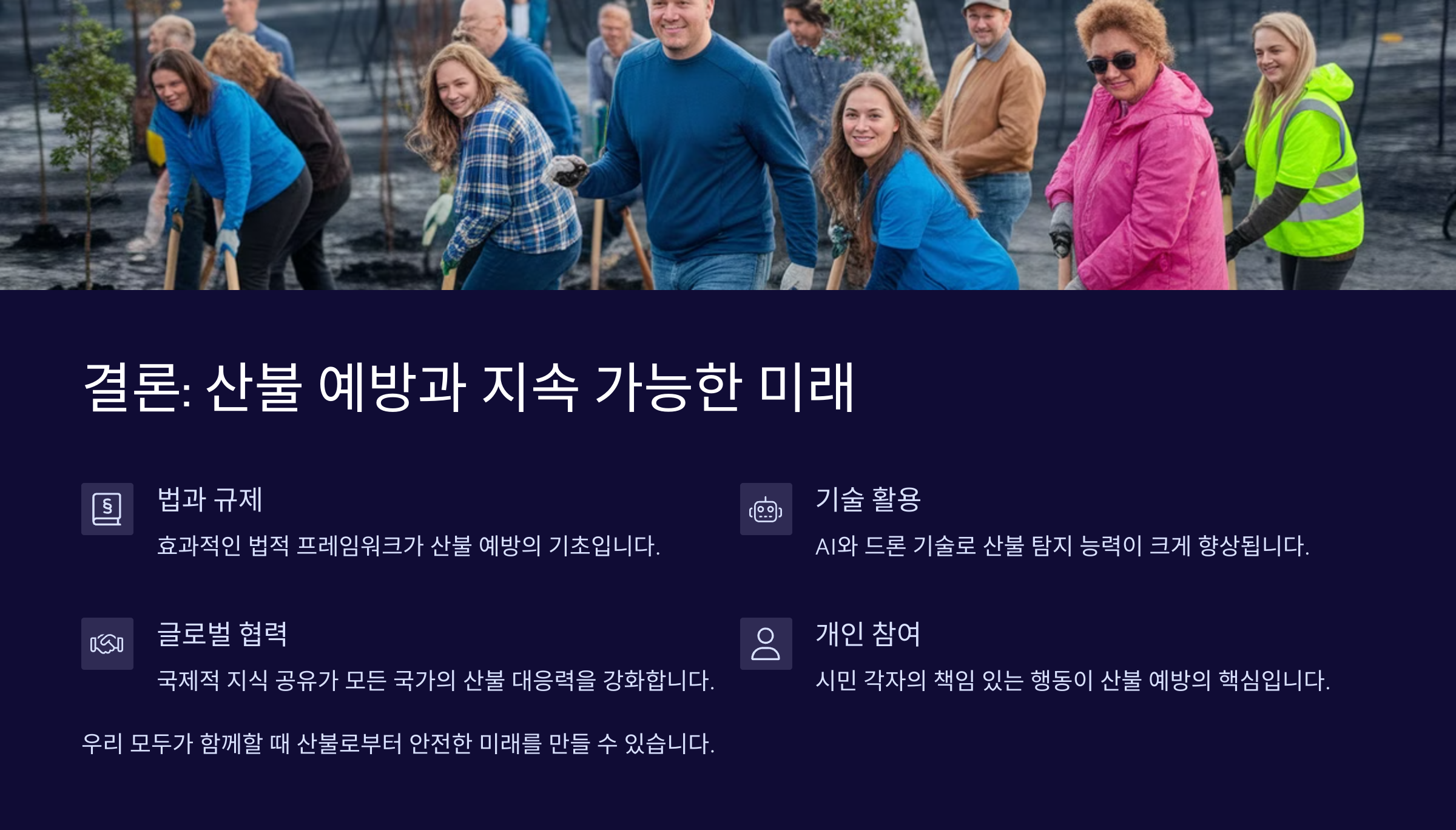 산불은 사람의 실수로 시작되는 경우가 많아요. 담배꽁초, 캠프파이어, 쓰레기 소각 등 작은 부주의가 거대한 화재로 이어질 수 있죠. 따라서 개인의 의식 변화와 더불어 제도적인 대응이 함께 이뤄져야 해요.