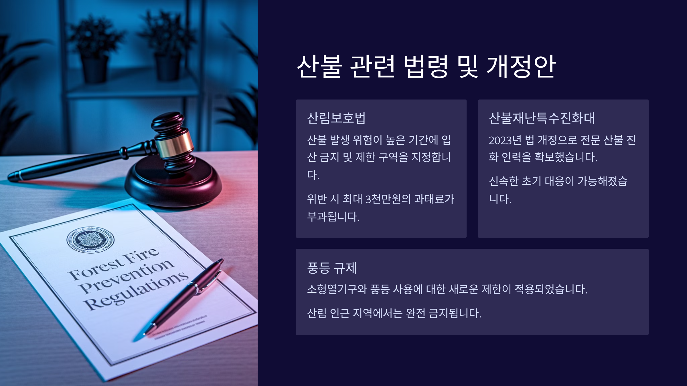 2023년에는 대형 산불이 연이어 발생하면서 관련 법안이 더욱 강화됐어요. 대표적으로는 '산불 예방관리법 개정안'이 통과되면서, 산불위험경보제도의 기준과 단계가 세분화됐고, 위반 시 처벌도 엄격해졌어요.