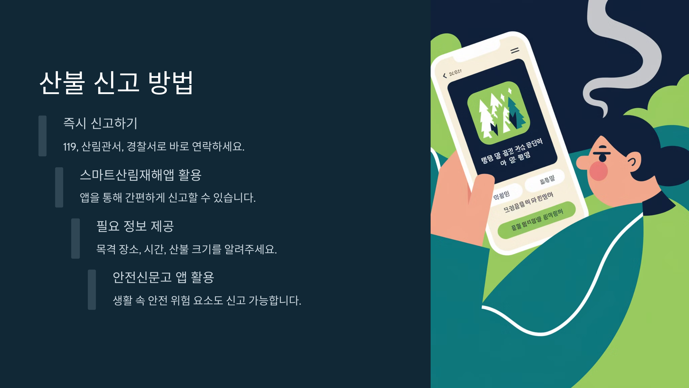 신고 시에는 “산불이 발생한 위치”, “불길의 크기”, “바람 방향”, “주변 위험 요소”까지 최대한 자세히 알려줘야 해요. 그리고 절대 불을 혼자 끄려고 하지 마세요. 전문 진화 장비 없이 접근하면 오히려 더 큰 사고가 날 수 있어요.🔥