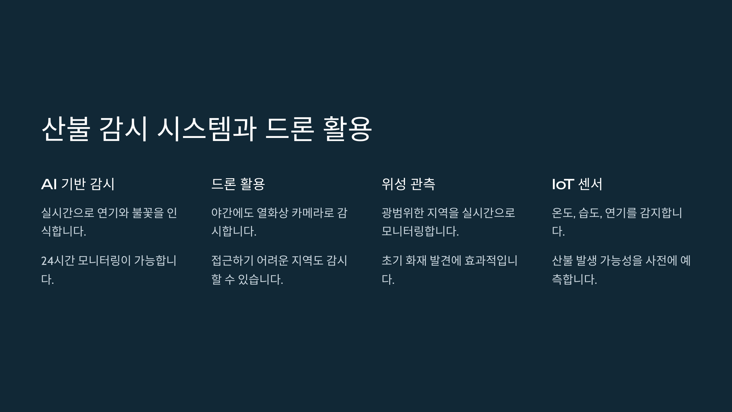 | 드론 | 산불 현장 정밀 촬영, 불씨 탐지 | 신속 대응, 접근성 우수 |