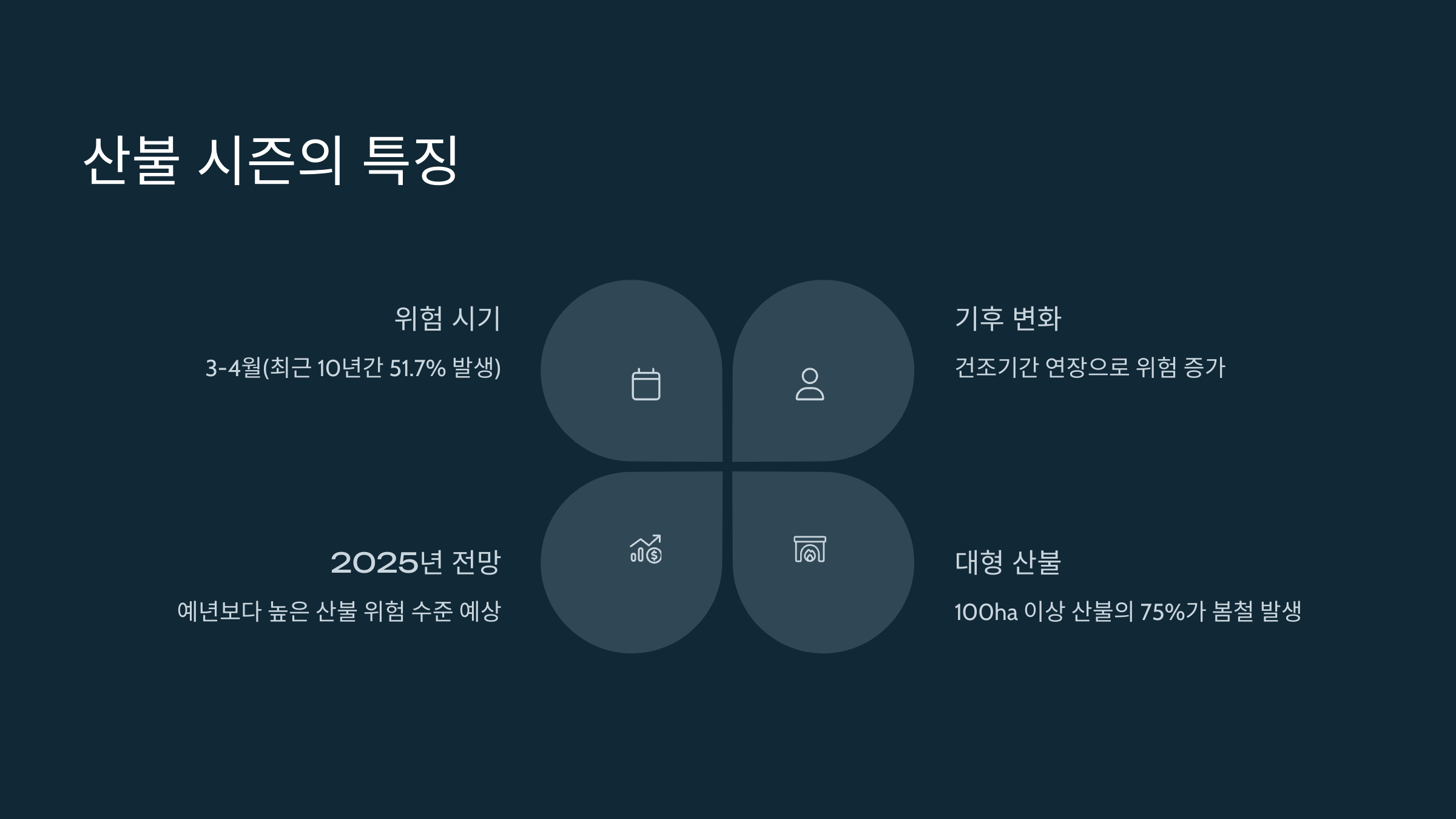 | 3~5월 | 건조, 강풍, 봄철 낙엽 축적 | 논두렁 소각, 등산객 부주의 |